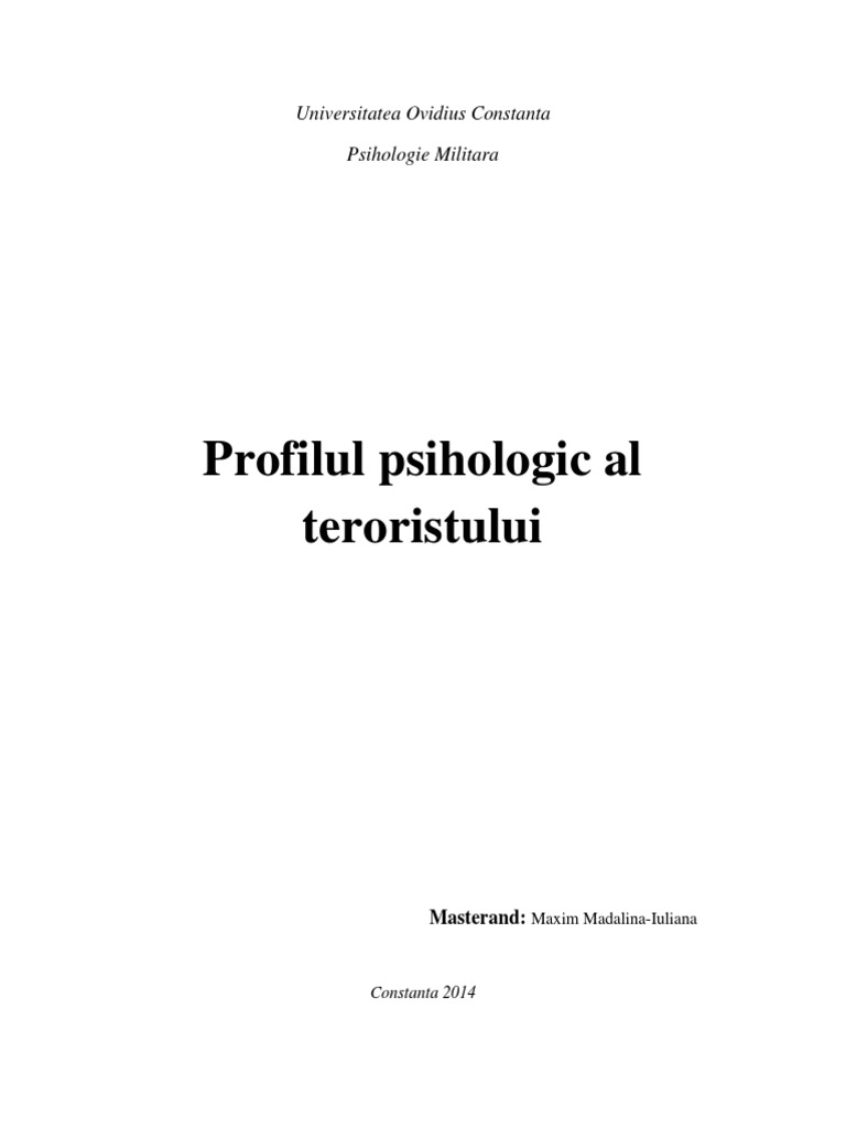 Bibliografie: 1. Albu Cristina, Arma psihologica intre limite si performante, Bucuresti, Editura Ministerului Internelor si Reformei Administrative, 2006 2. Delcea, C., (2006). Terorismul internaional, in Terorismul Azi, vol. 1, anul I, 39-72. Ed. ASCT: Cluj-Napoca. 3. Delcea, C., (2006). Psihologia terorismului. Studiu psihologic asupra teroritilor. Ediia a II a. Ed. Diversitas: Braov 4. Delcea Cristian i Bdulescu Aurelian, Terorismul: Studii i cercetri asupra fenomenului terorist, Cluj-Napoca: Editura RISOPRINT, 2008