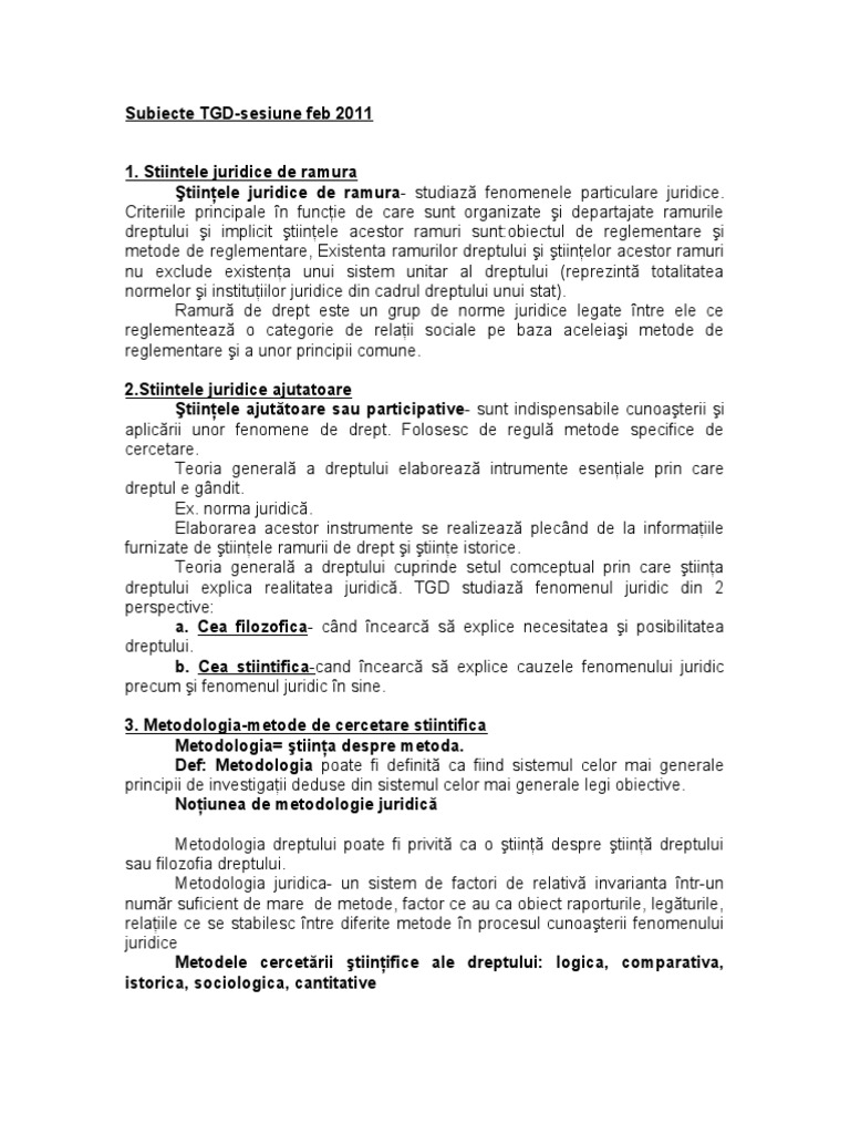 Criteriile principale n funcie de care sunt organizate i departajate ramurile dreptului i implicit tiinele acestor ramuri sunt:obiectul de reglementare i metode de reglementare, Existenta ramurilor dreptului i tiinelor acestor ramuri nu exclude existena unui sistem unitar al dreptului reprezint totalitatea normelor i instituiilor juridice din cadrul dreptului unui stat!. "amur de drept este un grup de norme juridice legate ntre ele ce reglementeaz o categorie de relaii sociale pe baza aceleiai metode de reglementare i a unor principii comune. [Link] juridice ajutatoare tiinele ajuttoare sau participative - sunt indispensabile cunoaterii i aplicrii unor fenomene de drept. #olosesc de regul metode specifice de cercetare. $eoria general a dreptului elaboreaz intrumente eseniale prin care dreptul e g%ndit. Ex. norma juridic. Elaborarea acestor instrumente se realizeaz plec%nd de la informaiile furnizate de tiinele ramurii de drept i tiine istorice. $eoria general a dreptului cuprinde setul comceptual prin care tiina dreptului explica realitatea juridic. $&' studiaz fenomenul juridic din ( perspecti)e: a. ea filo!ofica- c%nd ncearc s explice necesitatea i posibilitatea dreptului. b. ea stiintifica-cand ncearc s explice cauzele fenomenului juridic precum i fenomenul juridic n sine. ". #etodolo$ia-metode de cercetare stiintifica #etodolo$ia% &tiina despre metoda. Def' #etodolo$ia poate fi definit ca fiind sistemul celor mai generale principii de in)estigaii deduse din sistemul celor mai generale legi obiecti)e. (oiunea de metodolo$ie juridic *etodologia dreptului poate fi pri)it ca o tiin despre tiin dreptului sau filozofia dreptului. *etodologia juridica- un sistem de factori de relati) in)arianta ntr-un numr suficient de mare de metode, factor ce au ca obiect raporturile, legturile, relaiile ce se stabilesc ntre diferite metode n procesul cunoaterii fenomenului juridice #etodele cercetrii &tiinifice ale dreptului' lo$ica) comparativa) istorica) sociolo$ica) cantitative