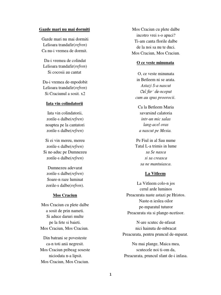 Da-i vremea de colindat Lelioara trandafir(refren) Si cocosii au cantat Da-i vremea de-mpodobit Lelioara trandafir(refren) Si Craciunul a sosit. x2 Iata vin colindatorii Iata vin colindatorii, zorile-s dalbe(refren) noaptea pe la cantatori zorile-s dalbe(refren) Si ei vin mereu, mereu zorile-s dalbe(refren) Si ne-aduc pe Dumnezeu zorile-s dalbe(refren) Dumnezeu adevarat zorile-s dalbe(refren) Soare-n raze luminat zorile-s dalbe(refren). Mos Craciun Mos Craciun cu plete dalbe a sosit de prin nameti. Si aduce daruri multe pe la fete si baieti. Mos Craciun, Mos Craciun. Din batrani se povesteste ca-n toti anii negresit. Mos Craciun pribeag soseste niciodata n-a lipsit. Mos Craciun, Mos Craciun.