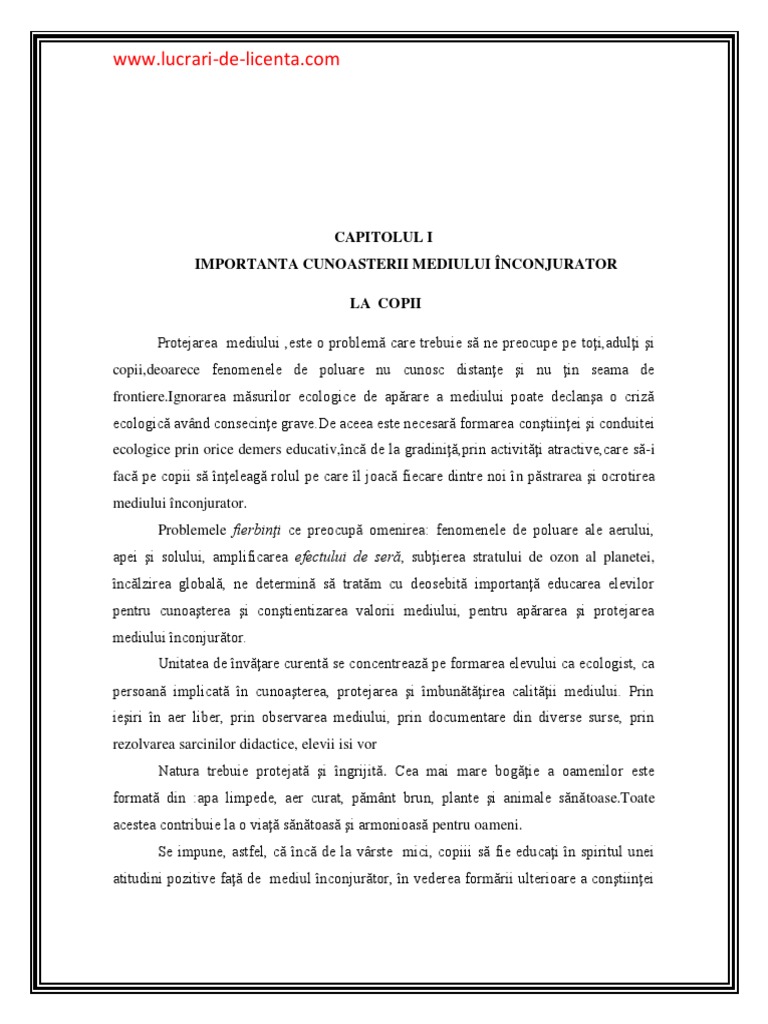 CAPITOLUL I IMPORTANTA CUNOASTERII MEDIULUI NCONJURATOR LA COPII Protejarea mediului ,este o problem care trebuie s ne preocupe pe toi,aduli i copii,deoarece fenomenele de poluare nu cunosc distane i nu in seama de [Link] msurilor ecologice de aprare a mediului poate declana o criz ecologic avnd consecine [Link] aceea este necesar formarea contiinei i conduitei ecologice prin orice demers educativ, nc de la gradini,prin activiti atractive,care s -i fac pe copii s neleag rolul pe care l joac fiecare dintre noi n p strarea i ocrotirea mediului nconjurator. Problemele fierbini ce preocup omenirea: fenomenele de poluare ale aerului, apei i solului, amplificarea efectului de ser, subierea stratului de ozon al planetei, nclzirea global, ne determin s tratm cu deosebit importan educarea elevilor pentru cunoaterea i contientizarea valorii mediului, pentru aprarea i protejarea mediului nconjurtor. Unitatea de nvare curent se concentreaz pe formarea elevului ca ecologist, ca persoan implicat n cunoaterea, protejarea i mbuntirea calitii mediului. Prin ieiri n aer liber, prin observarea mediului, prin documentare din diverse surse, prin rezolvarea sarcinilor didactice, elevii isi vor Natura trebuie protejat i ngrijit . Cea mai mare bogie a oamenilor este format din :apa limpede, aer curat, pmnt brun, plante i animale sn [Link] acestea contribuie la o via sntoas i armonioas pentru oameni. Se impune, astfel, c nc de la vrste mici, copiii s fie educai n spiritul unei atitudini pozitive fa de mediul nconjurtor, n vederea formrii ulterioare a contiinei