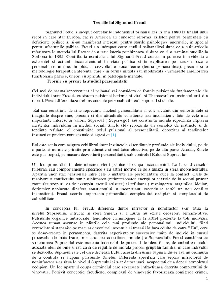 in care atat Europa, cat si America au cunoscut reforma azilelor pentru persoanele cu deficiente psihice si si-au manifestat interesul pentru starile psihologice anormale, in special pentru afecttunile psihice. Freud s-a indreptat catre studiul psihanalizei dupa ce a citit articole referitoare la metoda lui Breuer de a trata isteria prinhipnoza si dupa ce si-a terminat studiile la Sorbona in 1885. Contributia esentiala a lui Sigmund Freud consta in punerea in evidenta a existentei si actiunii inconstientului in viata psihica si in explicarea pe aceasta baza a personalitatii umane. In plus, a dezvoltat o noua teorie (teoria psihanalitica), precum si o metodologie terapeutica aferenta, care - in forma initiala sau modificata - urmareste ameliorarea functionarii psihice, uneori cu aplicatii in patologiile mentale. Teoriile cu privire la studiul personalitatii Cel mai de seama reprezentant al psihanalizei considera ca fortele pulsionale fundamentale ale individului sunt Erosul- ca sistem pulsional hedonic si vital, si Thanatosul ca instinctul urii si a mortii. Freud diferentiaza trei instante ale personalitatii: eul, supraeul si sinele. Eul sau constiinta de sine reprezinta nucleul personalitatii si este alcatuit din cunostiintele si imaginile despre sine, precum si din atitudinile constiente sau inconstiente fata de cele mai importante interese si valori; Supraeul ( Super-ego) sau constiinta morala reprezinta expresia existentei individului in mediul social; Sinele (Id) reprezinta un complex de instincte si de tendinte refulate, el constituind polul pulsional al personalitatii, depozitar al tendintelor instinctive predominant sexuale si agresive.[1] Eul este acela care asigura echilibrul intre instinctele si tendintele profunde ale individului, pe de o parte, si normele primite prin educatie si realitatea obiectiva, pe de alta parte. Asadar, Sinele este pus treptat, pe masura dezvoltarii personalitatii, sub controlul Eului si Supraeului. Un loc primordial in determinarea vietii psihice il ocupa inconstientul. La baza diverselor tulburari sau comportamente specifice stau astfel motive ce se situeaza in sfera inconstientului. Aparitia unor stari tensionale intre cele 3 instante ale personalitatii duce la conflict. Caile de rezolvare a conflictului sunt: sublimarea (redirectionarea energiilor sexuale de la scopul primar catre alte scopuri, ca de exemplu, creatii artistice) si refularea ( respingerea imaginilor, ideilor, dorintelor neplacute dinsfera constientului in inconstient, creandu-se astfel un nou conflict inconstient). Freud acorda importanta primordiala complexului oedipian si complexului de culpabilitate. In conceptia lui Freud, diferenta dintre infractor si nonifractor s-ar situa la nivelul Supraeului, intrucat in sfera Sinelui si a Eului nu exista deosebiri semnificative. Pulsiunile organice antisociale, tendintele criminogene ar fi astfel prezente la toti indivizii. Acestea raman ascunse in pliurile cele mai profunde ale personalitatii individului, fiind controlate si stapanite pe masura dezvoltarii acestuia si trecerii la faza adulta de catre " Eu", care se desavarseste in permanenta, datorita experientelor successive traite de individ in cursul procesului de maturizare, prin structura constiintei morale ( a Supraeului). Freud considera ca structurarea Supraeului este marcata indeosebi de procesul de identificare, de amintirea tatalui asociata ideii de bine si rau ca si de regulile de morala proprii grupului familial in care individul se dezvolta. Supraeul este cel care dicteaza Eului, acesta din urma supunandu-se sau nu ordinului de a controla si stapani pulsiunile Sinelui. Diferenta specifica care separa infractorul de noninfractor s-ar situa la nivelul Supraeului si s-ar datora unei incapacitati de a depasi complexul oedipian. Un loc aparte il ocupa criminalul care savarseste infractiunea datorita complexului de vinovatie. Potrivit conceptiei freudiene, complexul de vinovatie favorizeaza comiterea crimei,