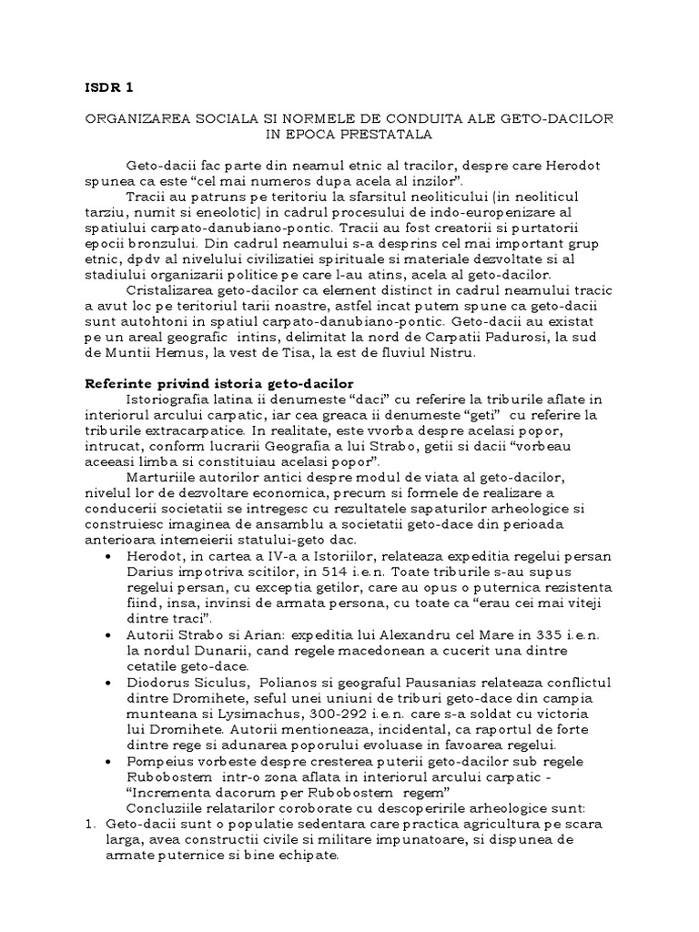 al tracilor, despre care Herodot spunea ca este cel mai numeros dupa acela al inzilor. Tracii au patruns pe teritoriu la sfarsitul neoliticului (in neoliticul tarziu, numit si eneolotic) in cadrul procesului de indo-europenizare al spatiului carpato-danubiano-pontic. Tracii au fost creatorii si purtatorii epocii bronzului. Din cadrul neamului s-a desprins cel mai important grup etnic, dpdv al nivelului civilizatiei spirituale si materiale dezvoltate si al stadiului organizarii politice pe care l-au atins, acela al geto-dacilor. Cristalizarea geto-dacilor ca element distinct in cadrul neamului tracic a avut loc pe teritoriul tarii noastre, astfel incat putem spune ca geto-dacii sunt autohtoni in spatiul carpato-danubiano-pontic. Geto-dacii au existat pe un areal geografic intins, delimitat la nord de Carpatii Padurosi, la sud de Muntii Hemus, la vest de Tisa, la est de fluviul Nistru. Referinte privind istoria geto-dacilor Istoriografia latina ii denumeste daci cu referire la triburile aflate in interiorul arcului carpatic, iar cea greaca ii denumeste geti cu referire la triburile extracarpatice. In realitate, este vvorba despre acelasi popor, intrucat, conform lucrarii Geografia a lui Strabo, getii si dacii vorbeau aceeasi limba si constituiau acelasi popor. Marturiile autorilor antici despre modul de viata al geto-dacilor, nivelul lor de dezvoltare economica, precum si formele de realizare a conducerii societatii se intregesc cu rezultatele sapaturilor arheologice si construiesc imaginea de ansamblu a societatii geto-dace din perioada anterioara intemeierii statului-geto dac. Herodot, in cartea a IV-a a Istoriilor, relateaza expeditia regelui persan Darius impotriva scitilor, in 514 i.e.n. Toate triburile s-au supus regelui persan, cu exceptia getilor, care au opus o puternica rezistenta fiind, insa, invinsi de armata persona, cu toate ca erau cei mai viteji dintre traci. Autorii Strabo si Arian: expeditia lui Alexandru cel Mare in 335 i.e.n. la nordul Dunarii, cand regele macedonean a cucerit una dintre cetatile geto-dace. Diodorus Siculus, Polianos si geograful Pausanias relateaza conflictul dintre Dromihete, seful unei uniuni de triburi geto-dace din campia munteana si Lysimachus, 300-292 i.e.n. care s-a soldat cu victoria lui Dromihete. Autorii mentioneaza, incidental, ca raportul de forte dintre rege si adunarea poporului evoluase in favoarea regelui. Pompeius vorbeste despre cresterea puterii geto-dacilor sub regele Rubobostem intr-o zona aflata in interiorul arcului carpatic Incrementa dacorum per Rubobostem regem Concluziile relatarilor coroborate cu descoperirile arheologice sunt: 1. Geto-dacii sunt o populatie sedentara care practica agricultura pe scara larga, avea constructii civile si militare impunatoare, si dispunea de armate puternice si bine echipate.