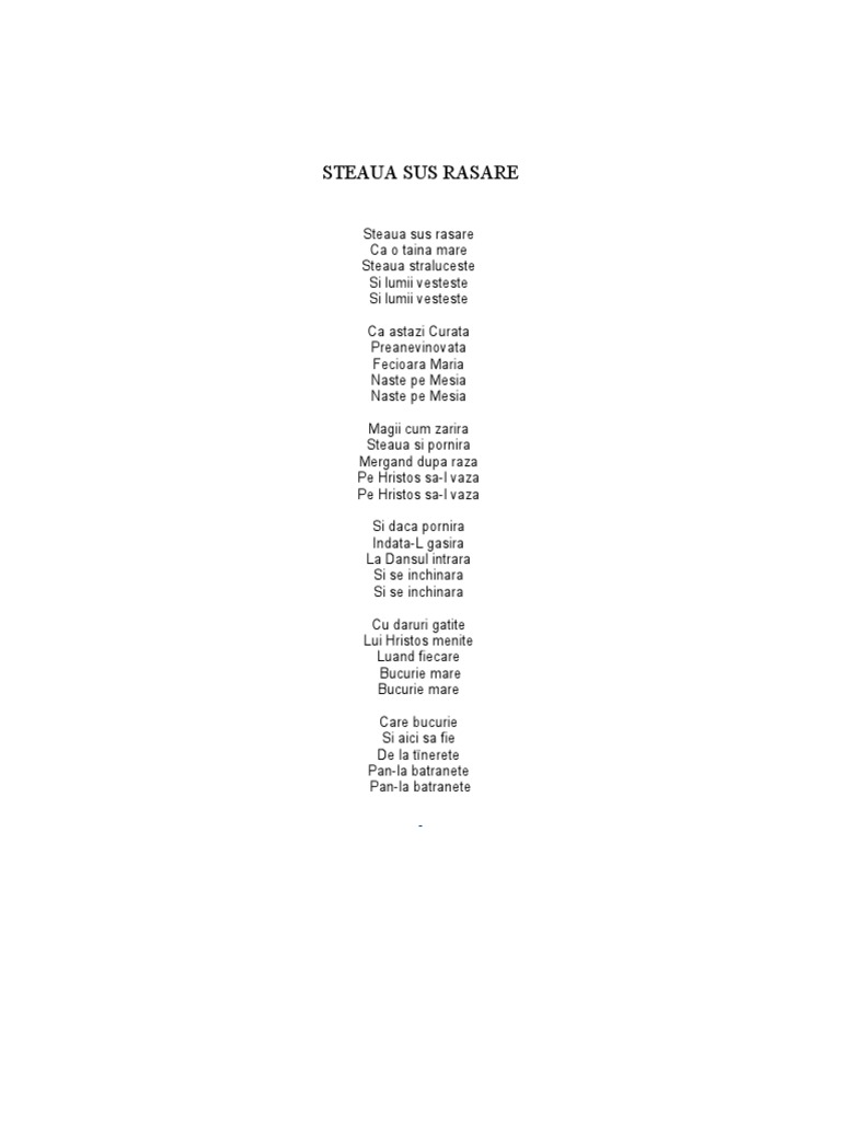 Steaua sus rasare Ca o taina mare Steaua straluceste Si lumii vesteste Si lumii vesteste Ca astazi Curata Preanevinovata Fecioara Maria Naste pe Mesia Naste pe Mesia Magii cum zarira Steaua si pornira Mergand dupa raza Pe Hristos sa-l vaza Pe Hristos sa-l vaza Si daca pornira Indata-L gasira La Dansul intrara Si se inchinara Si se inchinara Cu daruri gatite Lui Hristos menite Luand fiecare ucurie mare ucurie mare Care !ucurie Si aici sa fie De la t"nerete Pan-la !atranete Pan-la !atranete