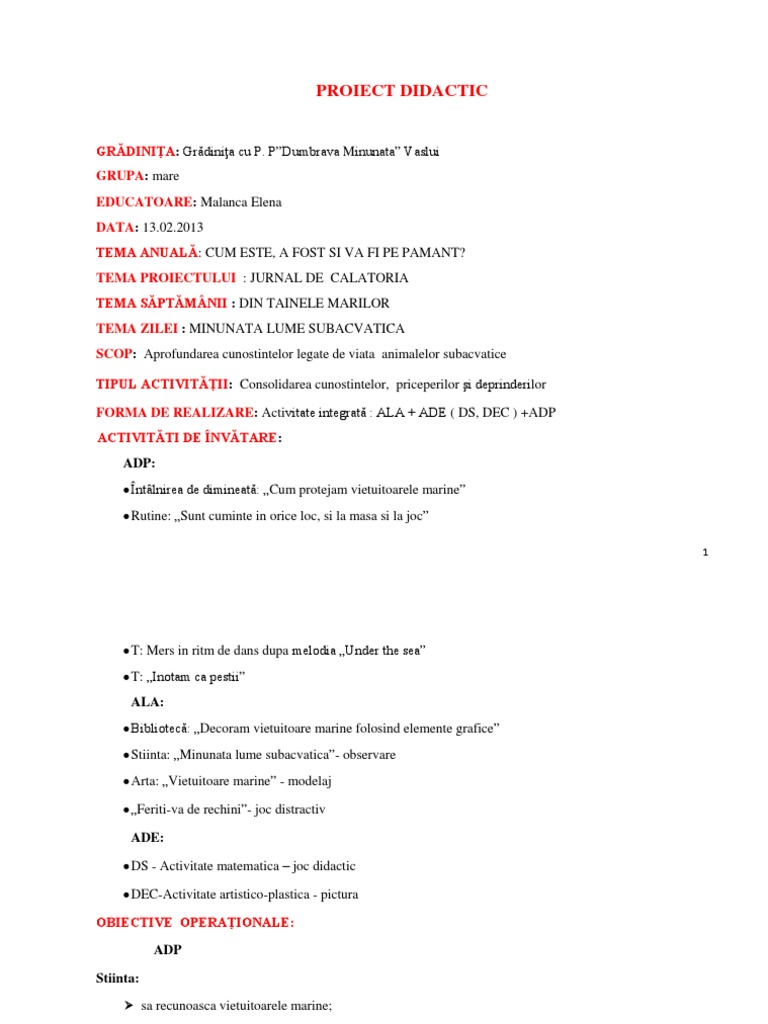 GRDINIA: Grdinia cu P. PDumbrava Minunata Vaslui GRUPA: mare EDUCATOARE: Malanca Elena DATA: 13.02.2013 TEMA ANUAL: CUM ESTE, A FOST SI VA FI PE PAMANT? TEMA PROIECTULUI : JURNAL DE CALATORIA TEMA SPTMNII : DIN TAINELE MARILOR TEMA ZILEI : MINUNATA LUME SUBACVATICA SCOP: Aprofundarea cunostintelor legate de viata animalelor subacvatice TIPUL ACTIVITII: Consolidarea cunostintelor, priceperilor i deprinderilor FORMA DE REALIZARE: Activitate integrat : ALA + ADE ( DS, DEC ) +ADP ACTIVITTI DE NVTARE: ADP: ntlnirea de dimineat: Cum protejam vietuitoarele marine Rutine: Sunt cuminte in orice loc, si la masa si la joc