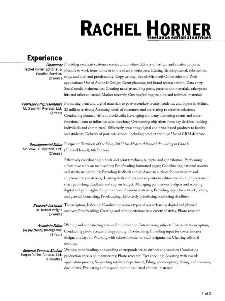 Rachel Horner Editorial & Flexible to work from-home or in the client's workspace; Editing (developmental, substantive, Creative Services (2 Years) copy, and line) and proofreading; Copy writing; Use of Microsoft Office suite and Web