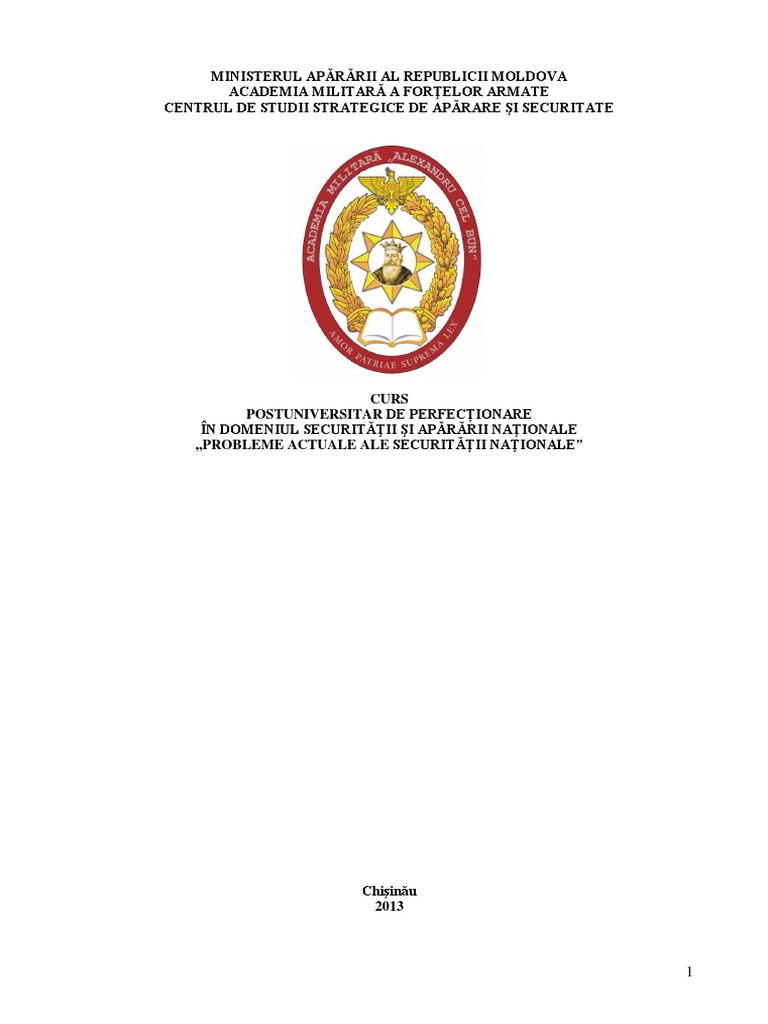 2. FIA SPECIALIZRII MINISTERUL APRRII AL REPUBLICII MOLDOVA ACADEMIA MILITAR A FORELOR ARMATE CENTRUL DE STUDII STRATEGICE DE APRARE I SECURITATE PROBLEME ACTUALE ALE SECURITII NAIONALE CURSUL POSTUNIVERSITAR DE PERFECIONARE N DOMENIUL SECURITII Specializarea I APRRII NAIONALE OBIECTIVELE GENERALE I SPECIFICEALE CURSULUI 1. Familiarizarea cu cele mai noi i avansate dezvoltri ale cunoaterii fenomenelor specifice problematicii securitii i aprrii naionale. 2. Acumularea de cunotine noi necesare exercitrii responsabilitilor n instituii, organizaii i organisme cu atribuii n sfera securitii i aprrii, precum i conexe acesteia. 3. Dezvoltarea capacitii de a aciona independent i creativ pentru consolidarea fundamentelor contiinei civice i a atitudinilor responsabile fa de evoluia democratic a societii i integrarea n structurile de securitate europene. 4. Formarea de abiliti cognitive privind modalitile concrete de aplicare, la locurile de activitate (n teritoriu), a prevederilor legislaiei n vigoare atribuite la sectorul de securitate i aprare de ctre principalele structuri de autoritate, civile i militare, cu responsabiliti n domeniu. COMPETENELE GENERALE I SPECIFICE ALE CURSULUI Competene generale Competene instrumentale: Capacitatea de analiz i sintez; Abiliti privind managementul informaiei; Capacitatea de organizare i planificare; Capacitatea de a soluiona probleme; Cunotine generale de baz; Capacitatea de a lua decizii. Competene interpersonale: Capacitatea de evaluare i autoevaluare; Capacitatea de a aprecia diversitatea i Capacitatea de a lucra n echip; multiculturalitatea; Abiliti interpersonale; Abilitatea de a lucra ntr-un context internaional; Abilitatea de a lucra ntr-o echip Capacitatea de a avea un comportament etic. interdiciplinar; Abilitatea de a colabora cu specialiti din alte domenii; Ministerul Instituia Centrul Cursul