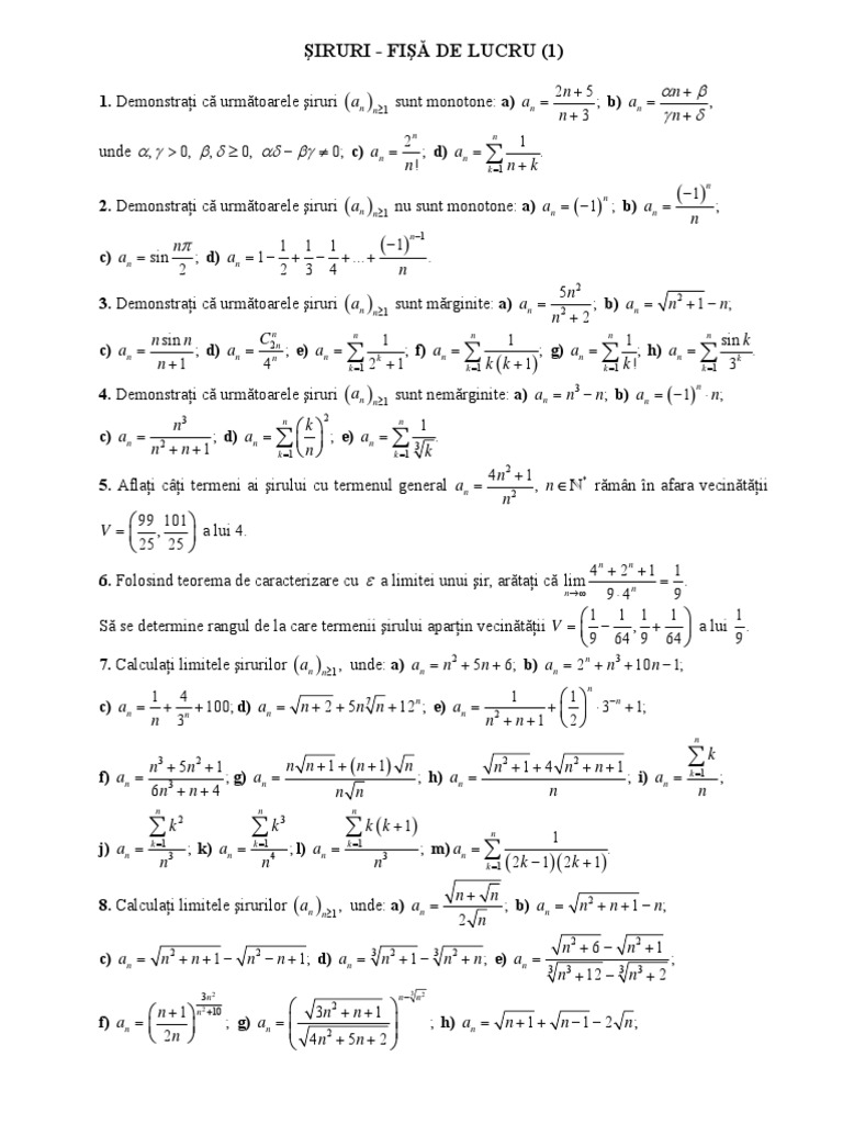5n 2 ; b) an = n 2 + 1 n; n2 + 2 n n n n Cn 1 1 1 sin k n sin n ; g) an = ; h) an = k . c) an = ; d) an = 2nn ; e) an = k ; f) an = 4 n +1 k =1 k ! k =1 k ( k + 1) k =1 2 + 1 k =1 3 3. Demonstrai c urmtoarele iruri ( an )n1 sunt mrginite: a) an = 4. Demonstrai c urmtoarele iruri ( an )n1 sunt nemrginite: a) an = n3 n; b) an = ( 1) n;