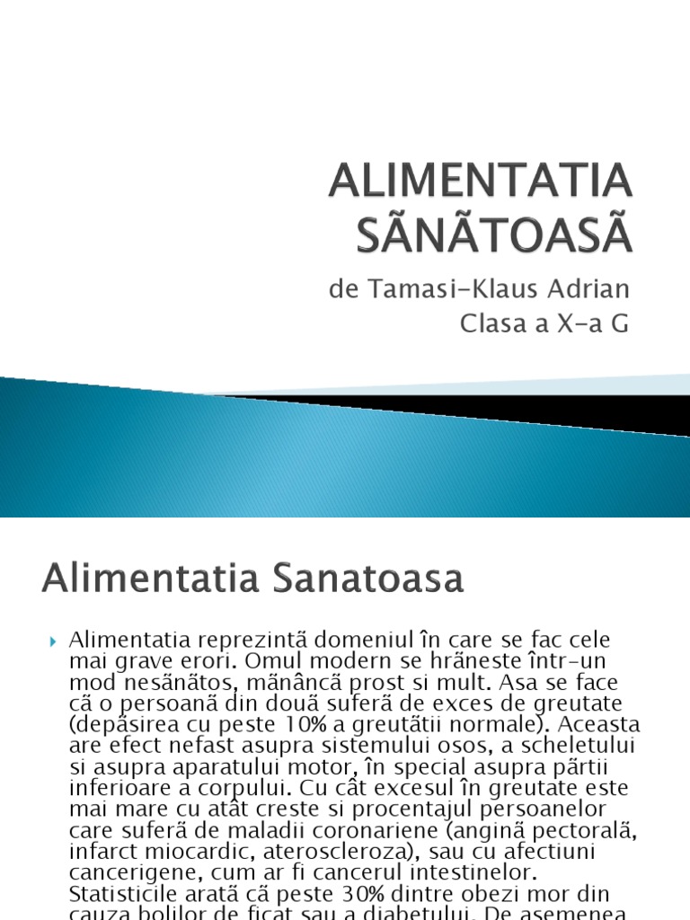 Alimentatia reprezint domeniul n care se fac cele mai grave erori. Omul modern se hrneste ntr-un mod nesntos, mnnc prost si mult. Asa se face c o persoan din dou sufer de exces de greutate (depsirea cu peste 10% a greuttii normale). Aceasta are efect nefast asupra sistemului osos, a scheletului si asupra aparatului motor, n special asupra prtii inferioare a corpului. Cu ct excesul n greutate este mai mare cu att creste si procentajul persoanelor care sufer de maladii coronariene (angin pectoral, infarct miocardic, ateroscleroza), sau cu afectiuni cancerigene, cum ar fi cancerul intestinelor. Statisticile arat c peste 30% dintre obezi mor din cauza bolilor de ficat sau a diabetului. De asemenea obezii pot avea probleme mult mai mari dect cei cu greutate normal n cazul unor inteventii chirurgicale.