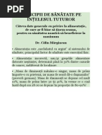 - se mnnc ncet, avnd timp suficient pentru consumarea mncrurilor, fr stres, fr ntreruperi ; - cu 15-20 de minute nainte de masa principal se poate consuma o salat sau un mic aperitiv, pentru a se micsora senzatia de foame, mrind satietatea; - se mnnc pe sturate, dar nu mai mult, chiar dac mncarea este foarte bun si gustoas; - se mnnc la ore fixe; - se mestec mult si bine, hrana trebuind frmitat nainte de a se nghiti, pentru a usura munca stomacului; - nu se beau lichide n timpul meselor, deoarece digestia este mai dificil, producnduse mai mult acid n stomac; - dup ora 17 nu se consum mese mbelsugate, bogate n proteine, greu de digerat, iar cu 2 ore nainte de culcare nu se mnnc nimic; - se recomand mprtirea celor 3 mese principale n cantitti mai mici, n 5-6 mese pe zi; - se mnnc numai cnd apare senzatia de foame, fiind interzis consumarea alimentelor de plictiseal sau pentru omorrea timpului; - seara, nainte de culcare se poate bea o can cu lapte cald, eventual ndulcit cu miere de albine, sau o can cu ceai din plante medicinale (tei, musetel).