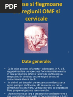 Cel mai frecvent abces dentar, evol. submucos Dureri pulsatile la debut, continue in evol Stadiu subperiostal : tumefiere congestiva a mucoasei, impastare, durere acuta, curbatura,febra,frison Dupa erodarea periostului durerile dispar, palparefluctuenta, edeme de parti moi functie de localizare (buza de tapir,palpebral,etc.) DGN POZ ex clinic+RX : radiotransp neomogena difuza periapicala sau forma rot.,regulata,omogena (proces mai vechi)