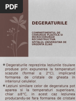 Factori favorizanti: - expunere prelungita Ia frig; - tulburari endocrine (insuficiente tiroidiene, ovariene, suprarenaliene); - carente vitarninice; - instabilitate vasculara periferica (acrocianoza); Semne clinice: - initial, vasoconstrictie locala dureroasa, la nivelul-zonelor expuse; - subiectiv: cauzalgii cu caracter de crampa sau de arsura. - obiectiv: localizare electiva Ia nivelul fetei dorsale a mainii, marginilor laterale ale degetelor, picioare sau calcaie; leziunea de degeratura: rotunda sau ovalara, cu margini mai mult sau mai putin conturate; tegumentele lucioase, edematoase, rosii-violacee; degetele ingrosate (ca niste carnaciori), mana deformata, prin infiltratia edematoasa a tesuturilor secundara tulburarilor circulatorii locale Vindecare lenta, cu persistenta tulburarilor de sensibilitate locala, de tip hiper sau anestezie.
