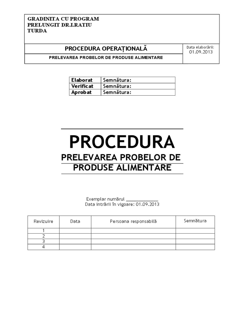 Referi #e" 1., Regulamentul -(E. nr. 1/012002 a Parlamentului European 2i al (on iliului $in 20 ianuarie 2002 $e ta!ilire a prin#ipiilor 2i #erintelor generale ale legi latiei n $omeniul alimentelor3 $e n4iin'are a &utorit'ii Europene pentru Siguran'a &limentelor 2i $e ta!ilire a pro#e$urilor n $omeniul iguran'ei alimentelor3 #u amen$amentele ulterioare% 2., Regulamentul -(E. nr. 0021200" al Parlamentului European 2i al (on iliului privin$ #ontroalele o4i#iale e4e#tuate pentru a e a igura veri4i#area #on4ormit'ii #u legi la'ia privin$ 5rana pentru animale 2i #ea privin$ alimentele 2i #u regulile $e ntate 2i $e !un tare a animalelor3 #u amen$amentele ulterioare% 3., Regulamentul -(E. nr. 20/31200) privin$ #riteriile mi#ro!iologi#e pentru alimente3 #u amen$amentele ulterioare% 1. Scopul procedurii : Procedura are ca scop organizarea i desfurarea activitilor de prelevare i pstrare / depozitarea probelor alimentare n vederea testrii microbiologice . 2. Aria de cuprindere : Procedura se aplic tuturor alimentelor preparate sau servite in institutie. . Re!pon!a"ili#a#i : 3.1. Procedura este aplicata de personalul bucatariei din gradinita. 3.2. C. .!.C. are responsabilitatea de revizuire anuala a procedurii. $. Con#inu#ul procedurii : Pregatirea sau prepararea alimentului care urmeaza a fi servit. Pregatirea recipientului curat si dezinfectat pentru prelevare