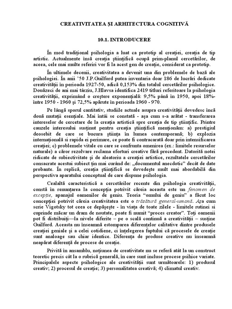 10.2. PRODUSUL CREATIV. DEFINIIA CREATIVITII. 9reativitatea nu este o capacitate psihic autonom, ci este rezultanta organizrii optime a unor factori de personalitate diferii. Ba nu este o dimensiune n plus a personalitii, ci efectul conlucrrii unor efecte psihice variate n condiii favorabile. 9a rezultant a ntregii personaliti, creativitatea e1ist numai sub forme specifice2 creativitate artistic, tiinific, tehnic etc. ;oate formele creativitii posed ns trsturi comune care fac posibil o definiie minimal a creativitii n general. Aceast definiie este o prim aproximaie5 definirea creativitii specifice --- singura care are referent real --- se realizeaz prin mbogirea definiiei generale cu note specifice. -eocamdat nu e1ist un consens asupra vreunei definiii a creativitii generale. C-ar putea ca, alturi de limitele cercetrii psihologice n problema menionat, nsi forma logic a definiiei s fie prea ngust, necorespunztoare pentru surprinderea comple1itii creaiei. [Link] n minte cele afirmate mai sus, creativitatea se poate defini ca un complex de nsuiri i aptitudini psihice care, n condiii favorabile, genereaz produse noi i de valoare pentru societate . #rodusele creaiei pot fi reprezentri artistice, teorii, idei, tehnologii, etc. 9reativitatea este deci o disponibilitate, o potenialitate a personalitii. Creaia este manifestarea acestei disponibiliti n condiii prielnice, transformarea n act a unei potenialiti. -efinirea creativitii se face, aadar, prin referire la produsele creaiei5 n ultim instan ele dau marca personalitii creative. Dn produs e nou dac nu este simpla reproducere a unor produse anterioare, dac este un unicat, care poate, va face obiectul unor reproduceri ulterioare. Dn produs este valoros, dac prin el se rezolv o problem, sporete adaptabilitatea la mediu a creatoruluiEgrupului su sau schimb condiiile existenei acestuia. 9reativitatea poate fi individual sau social. 7=orbim de creativitate individual - noteaz B. Fandau - atunci [Link] avem de-a face cu noul raportat la sfera e1perienelor individuale, despre creativitate social atunci [Link] acest nou este raportat la cultur. 9reativitatea individual este vital pentru dezvoltarea individului, constituie premisa creativitii sociale, indispensabil oricrei societi sau oricrei culturi8. -efiniia creativitii generale constituie o definiie minimal pentru creaia tiinific. #e [Link] criteriul noutii i al valorii, produsul creaiei tiinifice trebuie s satisfac criteriul verificabilitii 6ipoteza, teoria, soluia creat trebuie s poat fi confruntat cu realitatea, cel puin n principiu4 i criteriul consistenei logice. Gici una din aceste ultime cerine nu trebuie satisfcute de produsul creaiei artistice, de pild. Ce poate observa faptul c definiia creativitii se ntemeiaz pe o udecat de valoare asupra produsului creaiei 6prin care el e considerat nou, valoros etc4. Gota de subiectiv 6ireductibil4 a acestui tip de :udecat o face s fie fluctuant, variabil. n consecin, aprecierea produsului ca produs creativ este ea nsi