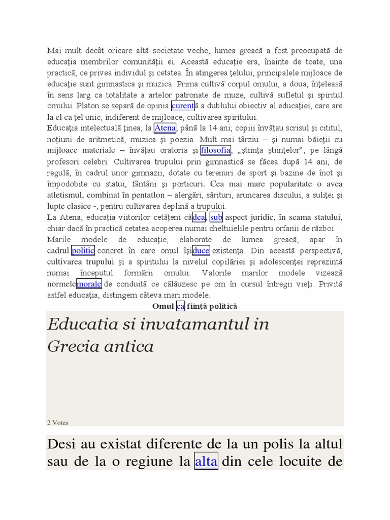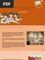 politic i social a oraului. Etica clasic poate fi rezumat n moto-ul kalos kgathos (frumos la nfiare i util societii) care indic valori dominante ale timpului i la care tinerii erau chemai s rspund. Atena clasic nu a instituionalizat nvmntul superior dup educaia elementar. Dar, noile condiii politice i sociale, create dup rzboaiele cu perii, l-au impus prin intermediul sofitilor n a doua jumtate a secolului al V-lea .Hr. Efectul predrii asupra tinerilor din clasa aristocrat a fost marcant. Sub titulatura general de filozofie, sofitii i nvau pe tineri disciplinele care nu erau predate n coala elementar: geometria, fizica, astronomia, medicina, arta, retorica i filozofia. Muli atenieni nu vedeau cu ochi buni etica sofitilor, fapt remarcat i de Aristofan (n Norii). Acetia remarcau cu ironie interesul, artat de sofiti, pentru bani i faptul c i influenau pe tineri cu nvturi care puneau la ndoial valorile de baz ale societii din acele timpuri (de exemplu: credina n zei i supunerea fa de legi). n schimb, Platon (n Pratagoras) i vede ca pe profesori adevrai care i educ pe oameni i care predau, aa numita arete, ce urmrete crearea unor caliti care s-l fac pe om superior, eficient i vestit. Pregtirea tinerilor dura 34 ani, timp n care acetia i urmau profesorii n oraele unde acetia ineau prelegeri publice. Unii dintre acetia sunt foarte bine [Link] primea 10.000 de drahme ( prin comparaie cu un muncitor care primea o drahm pentru o zi de munc). Isocrate fixeaz tariful la 1.000 de drahme. n predarea retoricii tinerii sunt nvai cum s creeze idei, cum s fac o disertaie despre dreptate i nedreptate, cum s foloseti locuri comune. n primul rnd i nva s devin eficieni. Dar pentru a putea vorbi oamenilor trebuie s ai o cultur general. n Atena sunt deschise, mai trziu, coli n care se predau concepiile proprii ale profesorilor: stoicism, cinism .a. Educaia spartan se deosebete de cea din celelalte ceti. Tinerele fete practic sporturile, ca i bieii. Ele particip la procesiuni, danseaz i cnt n timpul ceremoniilor religioase, n faa bieilor. Educaia se caracterizeaz prin nsuirea unui devotament absolut fa de stat. Cetatea este totul pentru cetean. Aceast concepie se manifest cu prilejul Jocurilor Olimpice, la care, ntre 720 .Hr i 576 .Hr, din optzeci de nvingtori, patruzeci i ase au fost spartani. Aceast educaie nu le asigur tinerilor nsuirea prea multor cunotine. Este suficient s tie s scrie i s citeasc. Cteva versuri din Homer, cnturi rzboinice (Tirteu), cteva poezii moraliste sunt suficiente. Prin contrast, n