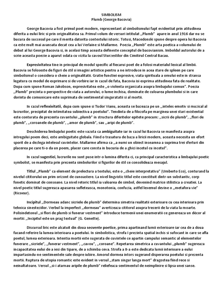 SIMBOLISM Elementul recurent este si laitmotivul peziei. Cuvantul ,,plumb reprezinta pe fondul unei crize de identitate idea de maxima apasare sufleteasca. Lexemul devine epitet la limita concretului materializand abstractiuni stranii si ambigue. Sentimentele de tristete, melancolie si apasare sufleteasca culmineaza cu cel al mortii, aspect care sunt orchestrate si evidentiate pe nivelurile limbajului poetic. La nivel lexical se poate remarca un numar redus de cuvinte datorita repetarilor. Termenul plumb se regaseste de sapte ori. La nivel morphologic se identifica un numar mare de substantive ce sustin planul descriptive. La nivel syntactic relatia dintre coordonare predomina frazele. Singura exceptie este versul ,,si-am inceput sa strig, propozitie subordonata menita sa evidentieze incapacitatea eului de a comunica cu iubirea. La nivel stylistic domina epitetul metaforic ,,de plumb care, invadand toate registrele lexical accentueaza ipostaza eului insingurat. La nivel fonetic, identificam recurenta consoanelor m si n care evidentiaza stari sufletesti negative. Fricativele f,v si s sugereaza discomfortul iar dominarea vocalei u accentueaza ideea claustrarii. La nivel prozodic poezia este alcatuita din doua catrene cu versuri cu masura de 10 silabe, iar ritmul iambic impune prezenta tonului elegiac. Tema poeziei o constituie conditia de damnat a poetului intr-o societate meschina, care nu-l intelege, o societate superficial, neputincioasa sa aprecieze valoarea adevaratei arte. Ideea exprima starea de melancolie, tristete, solitudine a poetului care se simte incatusat, sufocat spiritual in aceasta lume care-l apasa, in care se simte inchis definitive, fara a avea vreo solutie de evadare. Lirismul bacovian este evidentiat prin procesul de teatralizare marcat de prezeta eului liric. Lirismul subiectiv este dublat de cel al mastilor ,,stam singur in cavou, ,,stam singur langa mort. Nicolae Manolescu sustine ca prin opera lui Bacovia nu citim spovedania unui disperat si asistam la o punere in scena. Textul poate fi interpretat nu numai din perspectiva esteticii simboliste deoarece, datorita originalitatii, autenticitatea discursului este evidentiata prin directii estetice diferite. Poezia lui Bacovia este neindoielnic inscrisa in simbolismul European prin atmosfera, procedee, cromatica, muzicalitate, definindu-l pe poet ca fiind ,,pictor in cuvinte si compositor in vorbe (M. Petroveanu).