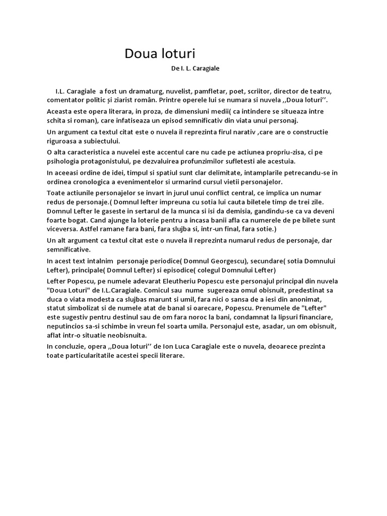 I.L. Caragiale a fost un dramaturg, nuvelist, pamfletar, poet, scriitor, director de teatru, comentator politic i ziarist romn. Printre operele lui se numara si nuvela ,,Doua loturi. Aceasta este opera literara, in proza, de dimensiuni medii( ca intindere se situeaza intre schita si roman), care infatiseaza un episod semnificativ din viata unui personaj. Un argument ca textul citat este o nuvela il reprezinta firul narativ ,care are o constructie riguroasa a subiectului. O alta caracteristica a nuvelei este accentul care nu cade pe actiunea propriu-zisa, ci pe psihologia protagonistului, pe dezvaluirea profunzimilor sufletesti ale acestuia. In aceeasi ordine de idei, timpul si spatiul sunt clar delimitate, intamplarile petrecandu-se in ordinea cronologica a evenimentelor si urmarind cursul vietii personajelor. Toate actiunile personajelor se invart in jurul unui conflict central, ce implica un numar redus de personaje.( Domnul lefter impreuna cu sotia lui cauta biletele timp de trei zile. Domnul Lefter le gaseste in sertarul de la munca si isi da demisia, gandindu-se ca va deveni foarte bogat. Cand ajunge la loterie pentru a incasa banii afla ca numerele de pe bilete sunt viceversa. Astfel ramane fara bani, fara slujba si, intr-un final, fara sotie.) Un alt argument ca textul citat este o nuvela il reprezinta numarul redus de personaje, dar semnificative. In acest text intalnim personaje periodice( Domnul Georgescu), secundare( sotia Domnului Lefter), principale( Domnul Lefter) si episodice( colegul Domnului Lefter) Lefter Popescu, pe numele adevarat Eleutheriu Popescu este personajul principal din nuvela "Doua Loturi" de [Link]. Comicul sau nume sugereaza omul obisnuit, predestinat sa duca o viata modesta ca slujbas marunt si umil, fara nici o sansa de a iesi din anonimat, statut simbolizat si de numele atat de banal si oarecare, Popescu. Prenumele de "Lefter" este sugestiv pentru destinul sau de om fara noroc la bani, condamnat la lipsuri financiare, neputincios sa-si schimbe in vreun fel soarta umila. Personajul este, asadar, un om obisnuit, aflat intr-o situatie neobisnuita. In concluzie, opera ,,Doua loturi de Ion Luca Caragiale este o nuvela, deoarece prezinta toate particularitatile acestei specii literare.