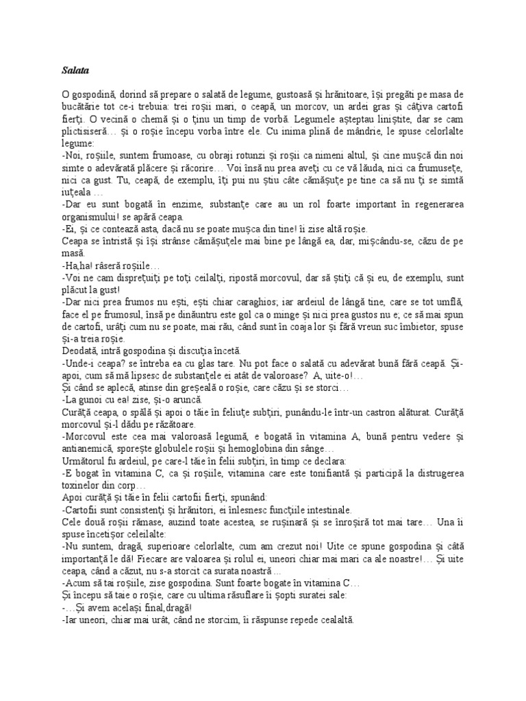 roii mari, o ceap, un morcov, un ardei gras i civa cartofi fieri. O vecin o chem i o inu un timp de vorb. Legumele ateptau linitite, dar se cam plictisiser i o roie ncepu vorba ntre ele. Cu inima plin de mndrie, le spuse celorlalte legume: - oi, roiile, suntem frumoase, cu obra!i rotun"i i roii ca nimeni altul, i cine mu c din noi simte o adevrat plcere i rcorire #oi ns nu prea avei cu ce v luda, nici ca frumusee, nici ca gust. $u, ceap, de e%emplu, i pui nu tiu cte cmue pe tine ca s nu i se simt iueala -&ar eu sunt bogat n en"ime, substane care au un rol foarte important n regenerarea organismului' se apr ceapa. -(i, i ce contea" asta, dac nu se poate muca din tine' i "ise alt roie. Ceapa se ntrist i i strnse cmuele mai bine pe lng ea, dar, micndu-se, c"u de pe mas. -)a,ha' rser roiile -#oi ne cam dispreuii pe toi ceilali, ripost morcovul, dar s tii c i eu, de e%emplu, sunt plcut la gust' -&ar nici prea frumos nu eti, eti chiar caraghios* iar ardeiul de lng tine, care se tot umfl, face el pe frumosul, ns pe dinuntru este gol ca o minge i nici prea gustos nu e* ce s mai spun de cartofi, uri cum nu se poate, mai ru, cnd sunt n coa!a lor i fr vreun suc mbietor, spuse i-a treia roie. &eodat, intr gospodina i discuia ncet. -+nde-i ceapa, se ntreba ea cu glas tare. u pot face o salat cu adevrat bun fr ceap. iapoi, cum s m lipsesc de substanele ei att de valoroase, -, uite-o' i cnd se aplec, atinse din greeal o roie, care c"u i se storci -La gunoi cu ea' "ise, i-o arunc. Cur ceapa, o spl i apoi o tie n feliue subiri, punndu-le ntr-un castron alturat. Cur morcovul i-l ddu pe r"toare. -.orcovul este cea mai valoroas legum, e bogat n vitamina -, bun pentru vedere i antianemic, sporete globulele roii i hemoglobina din snge +rmtorul fu ardeiul, pe care-l tie n felii subiri, n timp ce declara: -( bogat n vitamina C, ca i roiile, vitamina care este tonifiant i particip la distrugerea to%inelor din corp -poi cur i tie n felii cartofii fieri, spunnd: -Cartofii sunt consisteni i hrnitori, ei nlesnesc funciile intestinale. Cele dou roii rmase, au"ind toate acestea, se ruinar i se nroir tot mai tare +na i spuse ncetior celeilalte: - u suntem, drag, superioare celorlalte, cum am cre"ut noi' +ite ce spune gospodina i ct importan le d' /iecare are valoarea i rolul ei, uneori chiar mai mari ca ale noastre' i uite ceapa, cnd a c"ut, nu s-a storcit ca surata noastr ... --cum s tai roiile, "ise gospodina. 0unt foarte bogate n vitamina C i ncepu s taie o roie, care cu ultima rsuflare i opti suratei sale: -i avem acelai final,drag' -1ar uneori, chiar mai urt, cnd ne storcim, i rspunse repede cealalt.