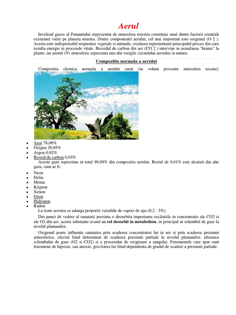 Invelisul gazos al Pamantului reprezentat de atmosfera terestra constituie unul dintre factorii esentiali existentei vietii pe planeta noastra. Dintre componentii aerului, cel mai important este oxigenul (O 2 ). Acesta este indispensabil respiratiei vegetale si animale, oxidarea reprezentand principalul proces din care rezulta energie in procesele vitale. Bioxidul de carbon din aer (CO 2 ) intervine in asimilarea "hranei" la plante, iar azotul (N) atmosferic reprezinta una din verigile circuitului azotului in natura.