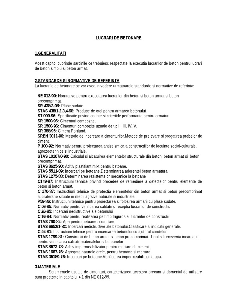 GENERALITATI Acest capitol cuprinde sarcinile ce trebuiesc respectate la executia lucrarilor de beton pentru lucrari de beton simplu si beton armat. [Link] SI NORMATIVE DE REFERINTA La lucrarile de betonare se vor avea in vedere urmatoarele standarde si normative de referinta: NE 012-99: Normative pentru executarea lucrarilor din beton si beton armat si beton precomprimat. SR 438/3-98: Plase sudate. STAS 438/1,2,3,4-98: Produse de otel pentru armarea betonului. ST 009-96: Specificatie privind cerinte si criteriide performanta pentru armaturi. SR 1 00/96: Cimenturi compozite. SR 1 00-96: Cimenturi compozite uzuale de tip II, III, IV, V. SR 388/9 : Ciment Portland. SREN 3011-96: etode de incercare a cimenturilor. etode de prelevare si pre!atirea probelor de ciment. ! 100-92: Normativ pentru proiectarea antiseismica a constructiilor de locuinte social"culturale, a!rozoote#nice si industriale. STAS 1010"/0-90: Calculul si alcatuirea elementelor structurale din beton, beton armat si beton precomprimat. STAS 862 -90: Aditiv plastifiant mixt pentru betoane. STAS 11-89: Incercari pe betoane.$eterminarea aderentei beton armatura. STAS 12" -88: $eterminarea rezistentelor mecanice la betoane C149-8": Instructiuni te#nice privind procedee de remediere a defectelor pentru elemente de beton si beton armat. C 1"0-8": Instructiuni te#nice de protectia elementelor din beton armat si beton precomprimat supraterane situate in medii a!rsive naturale si industriale. ! 9-86: Instructiuni te#nice pentru proiectarea si folosirea armarii cu plase sudate. C 6-8 : Normativ pentru verificarea calitatii si receptia lucrarilor de constructii. C 26-8 : Incercari nedistructive ale betonului C 16-84: Normativ pentru realizarea pe timp fri!uros a lucrarilor de constructii STAS "90-84: Apa pentru betoane si mortare STAS 66 2/1-82: Incercari nedistructive ale [Link] si indicatii !enerale. C 4-81: Instructiuni te#nice pentru incercarea betonului cu a%utorul carotelor. STAS 1"99-81: Constructii de beton armat si beton precomprimat. &ipul si freceventa incarcarilor pentru verificarea calitatii materialelor si betoanelor STAS 8 "3-"8: Aditiv impermeabilizator pentru mortare de ciment STAS 166"-"6: A!re!ate naturale !rele, pentru betoane si mortare. STAS 3 189-"6: Incercari pe [Link] impermeabilitatii la apa. [Link] Sortimentele uzuale de cimenturi, caracterizarea acestora precum si domeniul de utilizare sunt precizate in capitolul '.( din N) *(+",,.