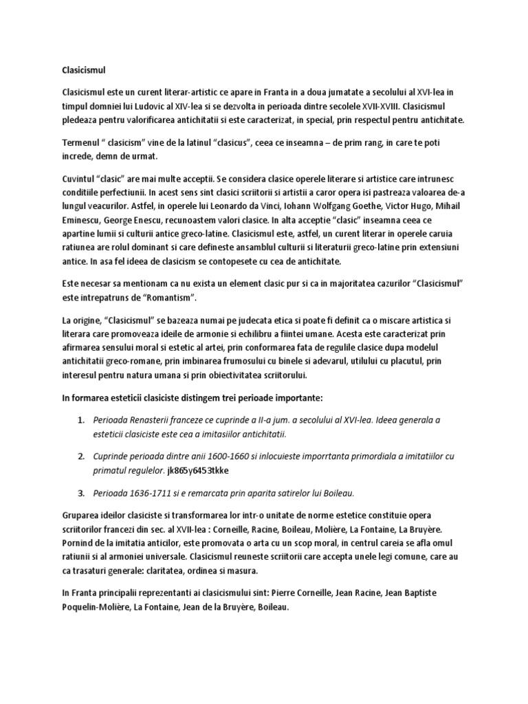 al XIV-lea si se dezvolta in perioada dintre secolele XVII-XVIII. Clasicismul pledeaza pentru valorificarea antichitatii si este caracterizat, in special, prin respectul pentru antichitate. Termenul clasicism vine de la latinul clasicus, ceea ce inseamna de prim rang, in care te poti increde, demn de urmat. Cuvintul clasic are mai multe acceptii. Se considera clasice operele literare si artistice care intrunesc conditiile perfectiunii. In acest sens sint clasici scriitorii si artistii a caror opera isi pastreaza valoarea de-a lungul veacurilor. Astfel, in operele lui Leonardo da Vinci, Iohann Wolfgang Goethe, Victor Hugo, Mihail Eminescu, George Enescu, recunoastem valori clasice. In alta acceptie clasic inseamna ceea ce apartine lumii si culturii antice greco-latine. Clasicismul este, astfel, un curent literar in operele caruia ratiunea are rolul dominant si care defineste ansamblul culturii si literaturii greco-latine prin extensiuni antice. In asa fel ideea de clasicism se contopesete cu cea de antichitate. Este necesar sa mentionam ca nu exista un element clasic pur si ca in majoritatea cazurilor Clasicismul este intrepatruns de Romantism. La origine, Clasicismul se bazeaza numai pe judecata etica si poate fi definit ca o miscare artistica si literara care promoveaza ideile de armonie si echilibru a fiintei umane. Acesta este caracterizat prin afirmarea sensului moral si estetic al artei, prin conformarea fata de regulile clasice dupa modelul antichitatii greco-romane, prin imbinarea frumosului cu binele si adevarul, utilului cu placutul, prin interesul pentru natura umana si prin obiectivitatea scriitorului. In formarea esteticii clasiciste distingem trei perioade importante: 1. Perioada Renasterii franceze ce cuprinde a II-a jum. a secolului al XVI-lea. Ideea generala a esteticii clasiciste este cea a imitasiilor antichitatii. 2. Cuprinde perioada dintre anii 1600-1660 si inlocuieste imporrtanta primordiala a imitatiilor cu primatul regulelor. jk865y6453tkke 3. Perioada 1636-1711 si e remarcata prin aparita satirelor lui Boileau. Gruparea ideilor clasiciste si transformarea lor intr-o unitate de norme estetice constituie opera scriitorilor francezi din sec. al XVII-lea : Corneille, Racine, Boileau, Molire, La Fontaine, La Bruyre. Pornind de la imitatia anticilor, este promovata o arta cu un scop moral, in centrul careia se afla omul ratiunii si al armoniei universale. Clasicismul reuneste scriitorii care accepta unele legi comune, care au ca trasaturi generale: claritatea, ordinea si masura. In Franta principalii reprezentanti ai clasicismului sint: Pierre Corneille, Jean Racine, Jean Baptiste Poquelin-Molire, La Fontaine, Jean de la Bruyre, Boileau.