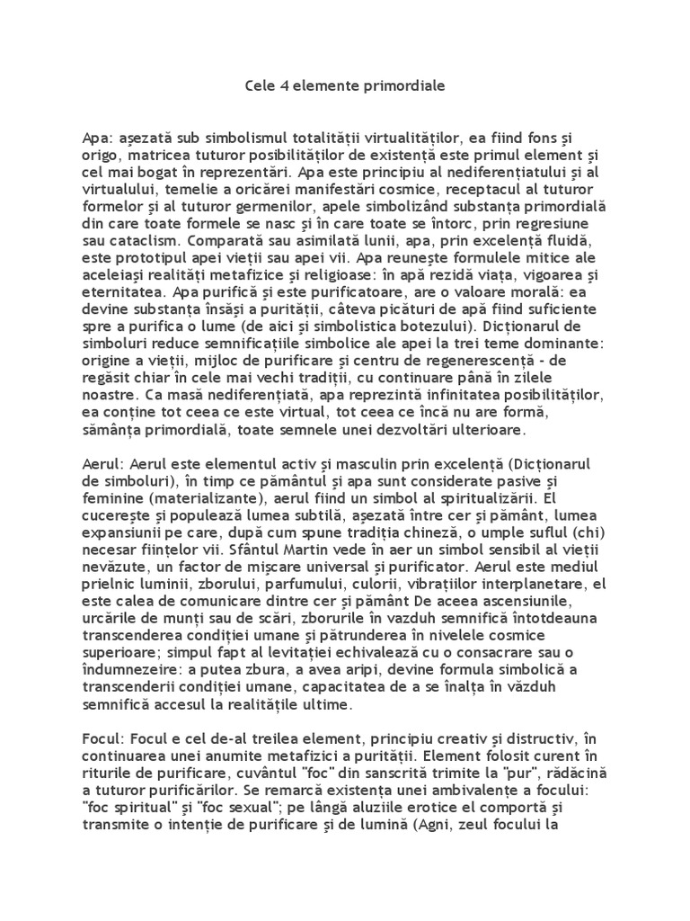 de existen este primul element i cel mai bogat n reprezentri. Apa este principiu al nedifereniatului i al virtualului, temelie a oricrei manifestri cosmice, receptacul al tuturor formelor i al tuturor germenilor, apele simboliz nd substana primordial din care toate formele se nasc i n care toate se ntorc, prin regresiune sau cataclism. Comparat sau asimilat lunii, apa, prin excelen fluid, este prototipul apei vieii sau apei vii. Apa reunete formulele mitice ale aceleiai realiti metafizice i religioase: n ap rezid viaa, vigoarea i eternitatea. Apa purific i este purificatoare, are o valoare moral: ea devine substana nsi a puritii, c teva picturi de ap fiind suficiente spre a purifica o lume !de aici i simbolistica botezului". #icionarul de simboluri reduce semnificaiile simbolice ale apei la trei teme dominante: origine a vieii, mi$loc de purificare i centru de regenerescen % de regsit c&iar n cele mai vec&i tradiii, cu continuare p n n zilele noastre. Ca mas nedifereniat, apa reprezint infinitatea posibilitilor, ea conine tot ceea ce este virtual, tot ceea ce nc nu are form, sm na primordial, toate semnele unei dezvoltri ulterioare. Aerul: Aerul este elementul activ i masculin prin excelen !#icionarul de simboluri", n timp ce pm ntul i apa sunt considerate pasive i feminine !materializante", aerul fiind un simbol al spiritualizrii. 'l cucerete i populeaz lumea subtil, aezat ntre cer i pm nt, lumea expansiunii pe care, dup cum spune tradiia c&inez, o umple suflul !c&i" necesar fiinelor vii. (f ntul )artin vede n aer un simbol sensibil al vieii nevzute, un factor de micare universal i purificator. Aerul este mediul prielnic luminii, zborului, parfumului, culorii, vibraiilor interplanetare, el este calea de comunicare dintre cer i pm nt #e aceea ascensiunile, urcrile de muni sau de scri, zborurile n vazdu& semnific ntotdeauna transcenderea condiiei umane i ptrunderea n nivelele cosmice superioare* simpul fapt al levitaiei ec&ivaleaz cu o consacrare sau o ndumnezeire: a putea zbura, a avea aripi, devine formula simbolic a transcenderii condiiei umane, capacitatea de a se nala n vzdu& semnific accesul la realitile ultime. +ocul: +ocul e cel de,al treilea element, principiu creativ i distructiv, n continuarea unei anumite metafizici a puritii. 'lement folosit curent n riturile de purificare, cuv ntul -foc- din sanscrit trimite la -pur-, rdcin a tuturor purificrilor. (e remarc existena unei ambivalene a focului: -foc spiritual- i -foc sexual-* pe l ng aluziile erotice el comport i transmite o intenie de purificare i de lumin !Agni, zeul focului la