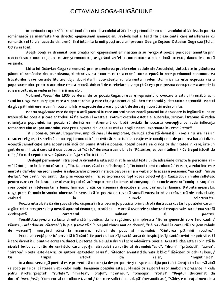 n perioada cuprins ntre ultimul deceniu al secolului al XIX-lea i primul deceniu al secolului al XX-lea, n poezia romneasc se manifest trei direcii: epigonismul eminescian, simbolismul i tendina clasicizant care interfereaz cu romantismul trziu, aceasta din urm fiind ntlnit la unii poei ardeleni precum George Cobuc, Octavian Goga sau tefan Octavian Iosif. Aceti poei au diminuat, prin creaia lor, epigonismul eminescian i au revigorat poezia perioadei amintite prin reactualizarea unor mijloace clasice i romantice, asigurnd astfel o continuitate a celor dou curente, dndu-le o not original. Lirica lui Octavian Goga se remarc prin prezentarea problemelor sociale ale Ardealului, sintetizate n cntarea ptimirii romnilor din Transilvania, al cror vis este unirea cu ara-mam. ntr-o epoc n care predomin continuitatea trsturilor unor curente literare deja abordate n coexisten cu elemente moderniste, lirica sa este expresia vie a poporanismului, printr-o atitudine realist-critic, dublat de o reliefare a vieii rneti prin prisma dorinei de a accede la sursele culturii, n vederea luminrii maselor. Volumul Poezii din 1905 se deschide cu poezia Rugciune care reprezint o evocare a satului transilvnean. Satul lui Goga este un spaiu care a suportat robia i care tnjete acum dup libertate social i demnitate naional. Poetul d glas ptimirii unui neam mbtrnit ntr-o expresie dureroas, prsit de doruri i rzvrtiri nemplinite. Poezia Rugciune este de fapt o art poetic n care autorul sintetizeaz punctul lui de vedere n legtur cu ce ar trebui s fie poezia i care ar trebui s fie mesajul acesteia. Potrivit crezului estetic al autorului, scriitorul trebuie s redea suferinele poporului, iar poezia s devin un instrument de lupt social. n aceast concepie se vede influena romantismului asupra autorului, care preia o parte din ideile lui Mihail Koglniceanu exprimate n Dacia literar. Titlul poeziei, cuvntul rugciune, implic sensul de implorare, de rug adresat divinitii. Poezia nu are ns un caracter religios, ci se refer la concepia romantic potrivit creia actul de creaie este condiionat de primirea harului divin. Aceast semnificaie este accentuat nc din prima strof a poeziei. Poetul poart un dialog cu divinitatea n care, ntr-un gest de umilin, i cere s i dea puterea s "cnte durerea neamului su:"Rtcitor, cu ochii tulburi, / Cu trupul istovit de cale, / Eu cad neputincios, stpne, / n faa strlucirii tale. Dialogul permanent ntre poet i divinitate este subliniat la nivelul textului de adresrile directe la persoana a IIa: "Printe, - ornduie-mi crarea!, "Tu, Doamne, vzul meu ndreapt., "n inim tu mi-o coboar. Prezena eului liric este marcat de folosirea pronumelor i adjectivelor pronominale de persoana I i a verbelor la aceeai persoan: "eu cad, "mi se desfac, "eu caut, "eu simt, dar prin vocea eului liric se exprim de fapt vocea colectivitii. Cauza zbuciumului sufletesc pentru care cere ndurare poetul este faptul c suferina neamului i mustr contiina. n numele acestor "umilii ai sorii ar vrea poetul s neleag taina lumii, farmecul vieii, ce nseamn dragostea i ura, cntecul i lumina. Datorit mesajului, Goga preia formula lirismului obiectiv, n sensul c n poezia de revolt social vocea liric va refuza tririle individuale, vorbind n numele colectivitii. Poezia este alctuit din ase strofe, dispuse n trei secvene poetice: prima strof ilustreaz cutrile poetului care na gsit calea creaiei sale i invoc ajutorul divinitii, strofele II V arat izvoarele i obictivul creaiei sale, iar ultima strof evideniaz caracterul militant al poeziei. Tonalitatea poeziei reflect diferite stri poetice, de la rugciune i implorare ("Eu n genunchi spre tine caut: / Printe, - ornduie-mi crarea!) la jale i revolt ("n pieptul zbuciumat de doruri, "D-mi viforul n care url / i gem robiile de veacuri), mergnd pn la asumarea rolului de poet al neamului: "Cntarea ptimirii noastre.. Prima secven poetic prezint frmntrile poetului care i caut sursa de inspiraie, i caut cuvintele potrivite. El i cere divinitii, printr-o adresare direct, puterea de a-i gsi drumul spre adevrata poezie. Aceast idee este subliniat la nivelul lexico-semantic de cuvintele care aparin cmpului semantic al drumului: "cale, "drum, "prpstii, "zarea, "crarea. Poetul este descris, cu ajutorul epitetelor, ca un fiu rtcitor, amintind de mitul biblic: "Rtcitor, cu ochii tulburi, / Cu trupul istovit de cale, "neputincios. n a doua secven poetic este prezentat concepia despre poezie i despre condiia poetului. Creaia trebuie s aib ca scop principal cntarea vieii celor muli. Imaginea poetului este subliniat cu ajutorul unor simboluri prezente n cele patru strofe: "pieptul, "sufletul, "mintea, "braul, "cntecul, "pleoapa, "rostul: "Pieptul zbuciumat de doruri (metafor), "Cum vor s-mi tulbure izvorul / Din care sufletul se-adap (personificare), "Sdete-n braul meu de-a