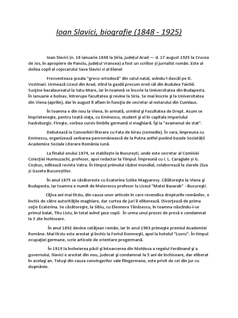Ioan Slavici (n. 18 ianuarie 1848 la iria, judeul Arad d. 17 august 1925 la Crucea de Jos, n apropiere de Panciu, judeul Vrancea) a fost un scriitor i jurnalist romn. Este al doilea copil al cojocarului Sava Slavici si al Elenei Frecventeaza coala "greco-ortodox" din satul natal, avndu-l dascl pe D. Vostinari. Urmeaz Liceul din Arad, stnd la gazd precum eroii si din Budulea Taichii. Susine bacalaureatul la Satu-Mare, iar n toamn se nscrie la Universitatea din Budapesta. n ianuarie e bolnav, ntrerupe facultatea i revine la Siria. Se mai nscrie i la Universitatea din Viena (aprilie), dar n august l aflam n funcia de secretar al notarului din Cumlaus. n toamna e din nou la Viena, n armat, urmnd i Facultatea de Drept. Acum se mprietenete, pentru toat viaa, cu Eminescu, student i el n capitala Imperiului hasbsburgic. Firete, vorbea cursiv limbile german si maghiar. i ia "examenul de stat". Debuteaz la Convorbiri literare cu Fata de birau (comedie). n vara, mpreuna cu Eminescu, organizeaz serbarea panromneasc de la Putna astfel punnd bazele Societii Academice Sociale Literare Romnia Jun. La finalul anului 1874, se stabilete la Bucureti, unde este secretar al Comisiei Coleciei Hurmuzachi, profesor, apoi redactor la Timpul. mpreun cu I. L. Caragiale i G. Cobuc, editeaz revista Vatra. n timpul primului rzboi mondial, colaboreaz la ziarele Ziua i Gazeta Bucuretilor. n anul 1875 se cstoreste cu Ecaterina Szke Magyarosy. Cltorete la Viena i Budapesta, iar toamna e numit de Maiorescu profesor la Liceul "Matei Basarab" - Bucureti. Civa ani mai trziu, din cauza unor articole n care revendica drepturile romnilor, e nchis de ctre autoritile maghiare, dar curtea de juri l elibereaz. Divoreaz de prima soie Ecaterina. Se cstorete, la Sibiu, cu Eleonora Tnsescu, n toamna nscndu -i-se primul baiat, Titu Liviu, n total avnd ase copii. n urma unui proces de pres e condamnat la 3 zile nchisoare. n anul 1892 devine cetean romn, iar n anul 1903 primete premiul Academiei Romne. Mai trziu este arestat i nchis la Fortul Domneti, apoi la hotelul "Luvru". n timpul ocupaiei germane, scrie articole de orientare progerman. n 1919 la ncheierea pcii i ntoarcerea din Moldova a regelui Ferdinand i a guvernului, Slavici e arestat din nou, judecat i condamnat la 5 ani de nchisoare, dar eliberat n acelai an. Totui din cauza convingerilor sale filogermane, este privit de cei din jur cu dumnie.
