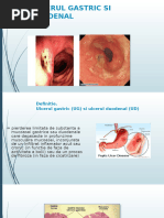 - dezechilibru ntre factorii agresori ai mucoasei (HCl,pepsin,[Link]., a.i.n.s.,etc) care i factorii protectori care. - Factri de agresiune ai mucoasei: Hipersecreie de HCl:[Link],tonus vagal,sensib. la gastrin i secr. de gastrin Hipersecreie de pepsinogen Tulburari de motilitate: - UG:hipomotilitate golire lent - UD: golire accelerat a stomac Helicobacter Pylori Reflux duodenogastric:acizi biliari,lizolecitin,[Link]