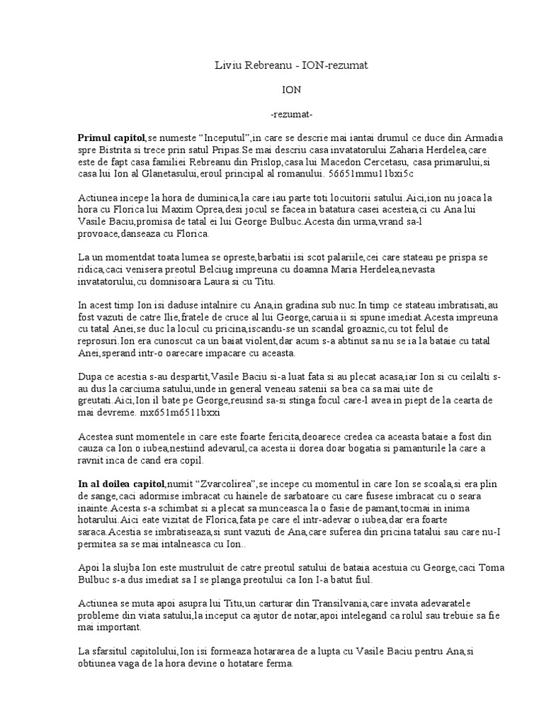 ION -rezumatPrimul capitol,se numeste Inceputul,in care se descrie mai iantai drumul ce duce din Armadia spre Bistrita si trece prin satul [Link] mai descriu casa invatat rului !a"aria #erdelea,care este de $apt casa $amiliei Rebreanu din Prisl p,casa lui %aced n &ercetasu, casa primarului,si casa lui I n al 'lanetasului,er ul principal al r manului. ())(*mmu**b+i(c Actiunea incepe la " ra de duminica,la care iau parte t ti l cuit rii [Link],i n nu , aca la " ra cu -l rica lui %a+im Oprea,desi , cul se $acea in batatura casei acesteia,ci cu Ana lui .asile Baciu,pr misa de tatal ei lui 'e r/e [Link] din urma,vrand sa-l pr v ace,danseaza cu -l rica. La un m mentdat t ata lumea se preste,barbatii isi sc t palariile,cei care stateau pe prispa se ridica,caci venisera pre tul Belciu/ impreuna cu d amna %aria #erdelea,nevasta invatat rului,cu d mnis ara Laura si cu 0itu. In acest timp I n isi daduse intalnire cu Ana,in /radina sub [Link] timp ce stateau imbratisati,au $ st vazuti de catre Ilie,$ratele de cruce al lui 'e r/e,caruia ii si spune [Link] impreuna cu tatal Anei,se duc la l cul cu pricina,iscandu-se un scandal /r aznic,cu t t $elul de repr suri.I n era cun scut ca un baiat vi lent,dar acum s-a abtinut sa nu se ia la bataie cu tatal Anei,sperand intr- arecare impacare cu aceasta. 1upa ce acestia s-au despartit,.asile Baciu si-a luat $ata si au plecat acasa,iar I n si cu ceilalti sau dus la carciuma satului,unde in /eneral veneau satenii sa bea ca sa mai uite de /[Link],I n il bate pe 'e r/e,reusind sa-si stin/a $ cul care-l avea in piept de la cearta de mai devreme. m+)(*m)(**b++i Acestea sunt m mentele in care este $ arte $ericita,de arece credea ca aceasta bataie a $ st din cauza ca I n iubea,nestiind adevarul,ca acesta ii d rea d ar b /atia si pamanturile la care a ravnit inca de cand era c pil. In al doilea capitol,numit !varc lirea,se incepe cu m mentul in care I n se sc ala,si era plin de san/e,caci ad rmise imbracat cu "ainele de sarbat are cu care $usese imbracat cu seara [Link] s-a sc"imbat si a plecat sa munceasca la $asie de pamant,t cmai in inima " [Link] eate vizitat de -l rica,$ata pe care el intr-adevar iubea,dar era $ arte [Link] se imbratiseaza,si sunt vazuti de Ana,care su$erea din pricina tatalui sau care nu-I permitea sa se mai intalneasca cu I n.. Ap i la slu,ba I n este mustruluit de catre pre tul satului de bataia acestuia cu 'e r/e,caci 0 ma Bulbuc s-a dus imediat sa I se plan/a pre tului ca I n I-a batut $iul. Actiunea se muta ap i asupra lui 0itu,un carturar din 0ransilvania,care invata adevaratele pr bleme din viata satului,la inceput ca a,ut r de n tar,ap i intele/and ca r lul sau trebuie sa $ie mai imp rtant. La s$arsitul capit lului,I n isi $ rmeaza " tararea de a lupta cu .asile Baciu pentru Ana,si btiunea va/a de la " ra devine " tatare $erma.
