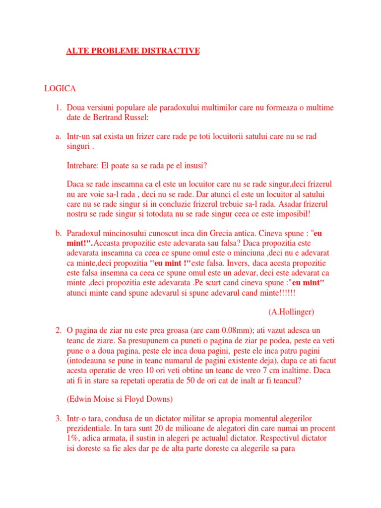LOGICA 1. Doua versiuni populare ale paradoxului multimilor care nu formeaza o multime date de Bertrand Russel: a. Intr-un sat exista un frizer care rade pe toti locuitorii satului care nu se rad singuri . Intrebare: El poate sa se rada pe el insusi? Daca se rade inseamna ca el este un locuitor care nu se rade singur,deci frizerul nu are voie sa-l rada , deci nu se rade. Dar atunci el este un locuitor al satului care nu se rade singur si in concluzie frizerul trebuie sa-l rada. Asadar frizerul nostru se rade singur si totodata nu se rade singur ceea ce este imposibil! b. Paradoxul mincinosului cunoscut inca din Grecia antica. Cineva spune : "eu mint!". Aceasta propozitie este adevarata sau falsa? Daca propozitia este adevarata inseamna ca ceea ce spune omul este o minciuna ,deci nu e adevarat ca minte,deci propozitia "eu mint !" este falsa. Invers, daca acesta propozitie este falsa insemna ca ceea ce spune omul este un adevar, deci este adevarat ca minte ,deci propozitia este adevarata .Pe scurt cand cineva spune :" eu mint" atunci minte cand spune adevarul si spune adevarul cand minte!!!!!! ([Link]) 2. O pagina de ziar nu este prea groasa (are cam 0.08mm); ati vazut adesea un teanc de ziare. Sa presupunem ca puneti o pagina de ziar pe podea, peste ea veti pune o a doua pagina, peste ele inca doua pagini, peste ele inca patru pagini (intodeauna se pune in teanc numarul de pagini existente deja), dupa ce ati facut acesta operatie de vreo 10 ori veti obtine un teanc de vreo 7 cm inaltime. Daca ati fi in stare sa repetati operatia de 50 de ori cat de inalt ar fi teancul? (Edwin Moise si Floyd Downs) 3. Intr-o tara, condusa de un dictator militar se apropia momentul alegerilor prezidentiale. In tara sunt 20 de milioane de alegatori din care numai un procent 1%, adica armata, il sustin in alegeri pe actualul dictator. Respectivul dictator isi doreste sa fie ales dar pe de alta parte doreste ca alegerile sa para