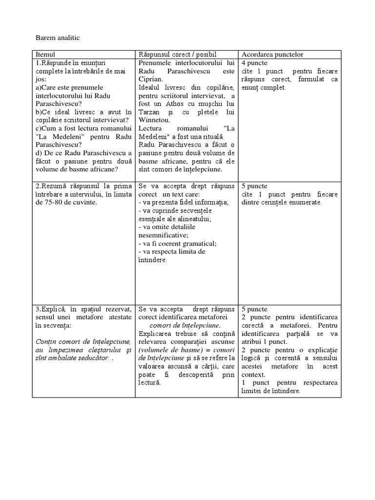 [Link] rspunsul la prima Se va accepta drept rspuns 5 puncte ntrebare a interviului, n limita corect un text care: cte 1 punct pentru fiecare de 75-80 de cuvinte. - va prezenta fidel informaia; dintre cerinele enumerate. - va cuprinde secvenele eseniale ale alineatului; - va omite detaliile nesemnificative; - va fi coerent gramatical; - va respecta limita de ntindere.