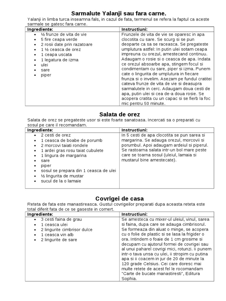 Yalanji in limba turca inseamna fals, in cazul de fata, termenul se refera la faptul ca aceste sarmale se gatesc fara carne. Ingrediente: Instructiuni: frunze de vita de vie Frunzele de vita de vie se oparesc in apa clocotita cu sare. Se scurg si se pun 5 fire ceapa verde deoparte ca sa se raceasca. Se pregateste 2 rosii date prin razatoare umplutura astfel: n putin ulei sotam ceapa 1 ceasca de orez impreuna cu orezul, amestecand continuu. 1 ceapa uscata !daugam o rosie si o ceasca de apa. ndata 1 legatura de izma ce orezul absoarbe apa, stingem focul si ulei condimentam cu sare, piper si izma. "unem sare cate o lingurita de umplutura in fiecare piper frunza si o invelim. !sezam pe fundul cratitei cateva frunze de vita de vie si deasupra sarmalutele in cerc. !daugam doua cesti de apa, putin ulei si cea de#a doua rosie. Se acopera cratita cu un capac si se fierb la foc mic pentru 5$ minute.