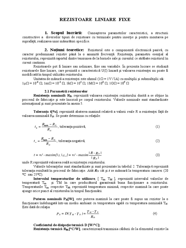 caracter predominant rezistiv pn la o anumit frecven. Rezistena, parametru esenial al rezistorului, reprezint raportul dintre tensiunea de la bornele sale i curentul ce strbate rezistorul n curent continuu. Rezistoarele pot fi liniare sau neliniare, fixe sau variabile. n prezenta lucrare se studiaz rezistoarele fixe liniare, care prezint o caracteristic U(I) liniar i valoarea rezistenei nu poate fi modificat n timpul utilizrii rezistorului. Unitatea de msur a rezistenei este ohmul (1 = 1V / lA) cu multiplii i submultiplii si: 1 = 10-6 , 1m = 10-3 , 1k = 103 , 1M = 106 , 1G = 109 2.1 Parametrii rezistoarelor Rezistena nominal RN, reprezint valoarea rezistenei rezistorului dorit a se obine n procesul de fabricaie i este nscris pe corpul rezistorului. Valorile nominale sunt standardizate internaional i sunt prezentate n anexa 5. Tolerana t[%], reprezint abaterea maxim relativ a valorii reale R a rezistenei fa de valoarea nominal RN. Se poate determina cu relaiile: