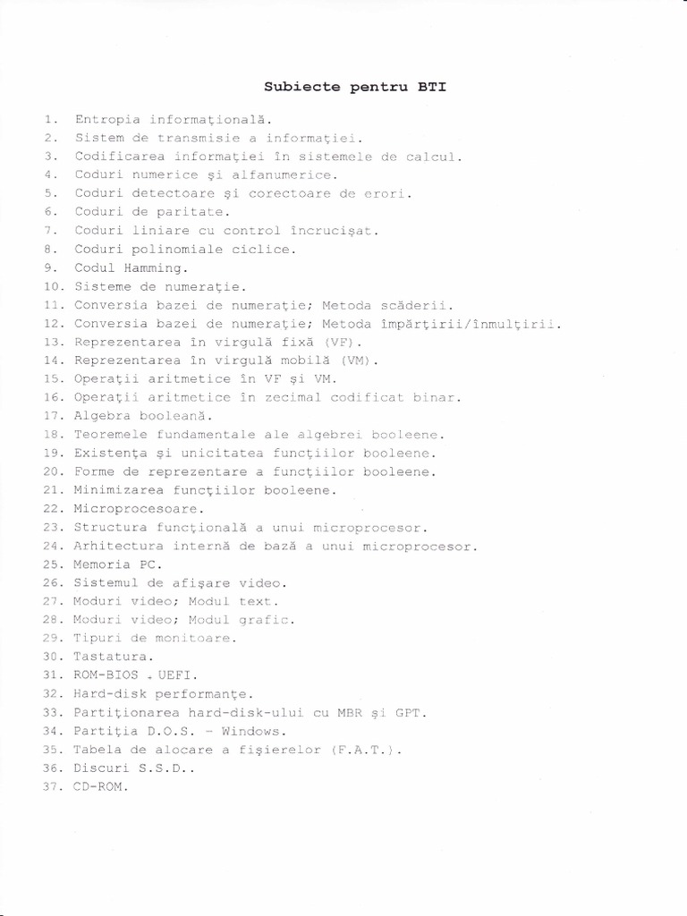 Entropia informationa15. Srstem de transmisje a rnforma!rer. Codificarea informatiei 1n sistemele de calcul. Coduri numerice gi alfanumerice. Coduri derecroare gr corecLoare de erorr . Coduri de paritare. Coduri liniare cu controf incruciqat. Codrr-i nol in6mi3ls ciclice. Codul Hamming. Sisteme de numerafie. Conversia bazei de numeratre,' Metoda sc5derii. Conversia bazei de numeraIie; Metoda impbrgirii/] ReprezenLarea in virgulS fixS (Vf). Reprezenrarea in virgulS mobilS (VM). Operatii aritmetice ln VF 9i VM. Operatii aritmetrce in zecimal codificat binar. Alrohr: h.,Olean5. Teoremele fundamentale ale algebrer bcoleene.