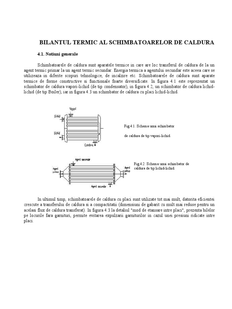 4.2. Calculul ter ic al !c"i #atoarelor $e cal$ura *rin efectuarea unui bilant termic real al unui schimbator de caldura se urmareste determinarea randamentului termic al acestuia. In cazul in care acesta nu este corespunzator, se impune luarea unor masuri de imbunatatire. Ecuatia generala a bilantului termic este& + , - , (4.1) unde& este flu$ul de caldura cedat de agentul termic primar' - flu$ul de caldura primit de agentul