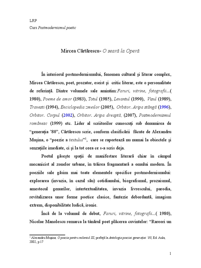 abia atunci sc nteie2 c nd de/un sur s se las fecundat.2 Abia atunci g ndirea lui ad nc2 rm ne grea, *i plin e de rod2 c nd luntrea i se sparge ca de/o st nc2 .n $ndri de al roc,iei izvod.2 Artistul e/a domni$ei lui mireas2 *i/n grele c,inuri na*te mintea sa52 de*i din carnea lui a fost s ias,2 poemul e asemenea cu ea.2 ptrunde, deci, din nou .n al meu g nd,2 s/$i nasc copii, ce n/or muri cur nd.) Poemul O sear la oper este un text reprezentati pentru specificul poeticii postmoderniste, prin re italizarea re0istrelor stilistice clasice, prin in azia cotidianului, inserarea elementelor prozaice, intertextualitate i li resc, [Link] ludic, fantezie [Link]. Pentru Crtrescu lumea este text iar poezia este artificiu, con enie, produs al spiritului su ironic.