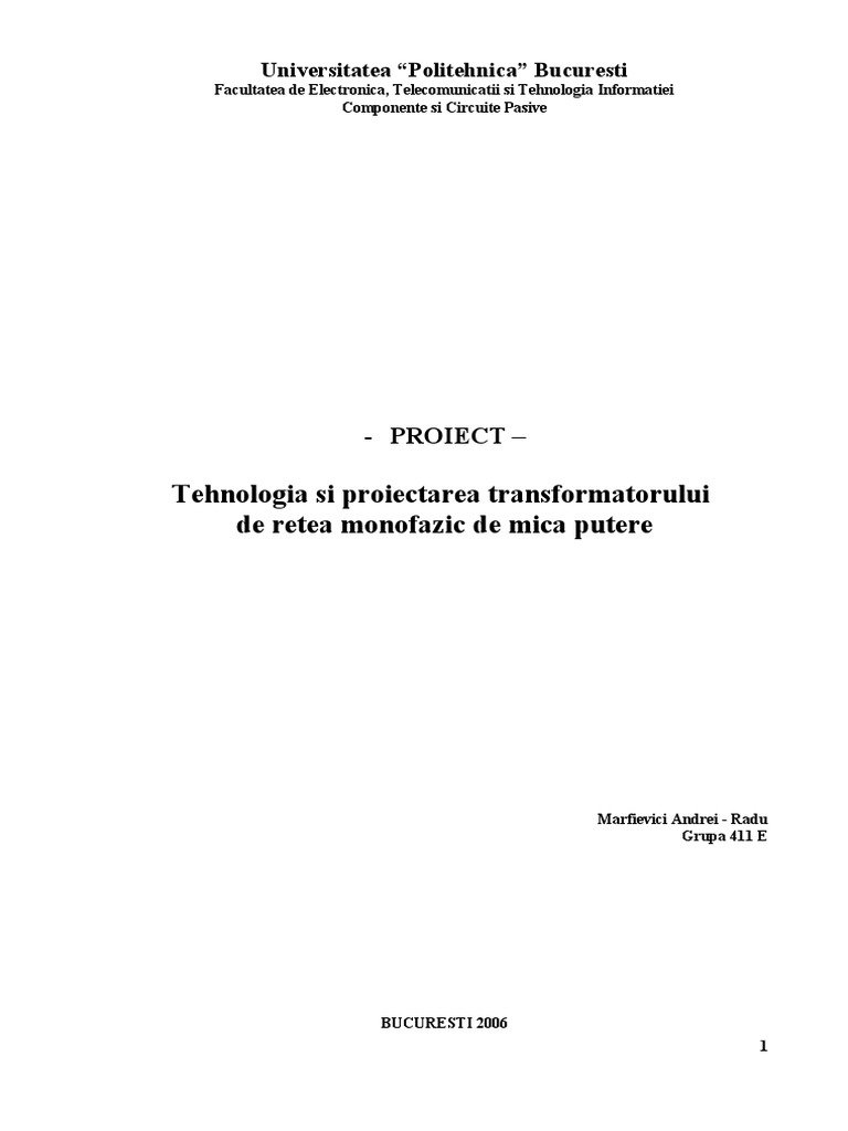 (5 Re"umat $cest proiect are ca scop reali"area unui transformator de mica putere5 $ceast1 component1 este pre"ent1 0n aproape toate tipurile de scheme de alimentare ale aparatelor electronice sta.ionare5 El este destinat s1 reali"e"e [Link] ca modific1ri ale valorilor tensiunilor 2i [Link], de la nivelul la care sunt preluate de c1tre circuitul primar, de la [Link], la valorile cerute 0n circuitul sau circuitele secundarului5 -e%asemenea, aceast1 component1 i"olea"1 galvanic fa.1 de [Link] 2asiul aparatului electronic, 0n care este montat, asigur?nd astfel electrosecuritatea persoanelor care 0l manipulea"15 Un transformator de [Link] are urm1toarele p1r.i componente= carcas1 electroi"olant1> 0nf12ur1ri= primar1 2i secundar1 8sau secundare9> mie" magnetic> sistem de str?ngere a mie"ului 2i de fiDare a transformatorului5