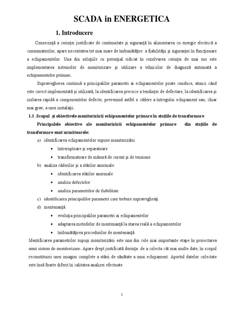 Consecin a cerinei justificate de continuitate i siguran n alimentarea cu energie electric a consumatorilor, apare necesitatea tot mai mare de mbuntire a fiabilitii i siguranei n funcionare a echipamentelor. Una din soluiile cu potenial ridicat n rezolvarea cerinei de mai sus este implementarea sistemelor de monitorizare i utilizare a tehnicilor de diagnoz automat a echipamentelor primare. Supravegherea continu a principalilor parametri ai echipamentelor poate conduce, atunci cnd este corect implementat i utilizat, la identificarea precoce a tendinei de defectare, la identificarea i izolarea rapid a componentelor defecte, prevenind astfel o cdere a ntregului echipament sau, chiar mai grav, a unei instalaii. 1.1 .Scopul i obiectivele monitorizrii echipamentelor primare n staiile de transformare Principalele obiective ale monitorizrii echipamentelor primare transformare sunt urmtoarele: a) identificarea echipamentelor supuse monitorizrii: ntreruptoare i separatoare transformatoare de msur de curent i de tensiune identificarea strilor anormale analiza defectelor analiza parametrilor de fiabilitate din staiile de