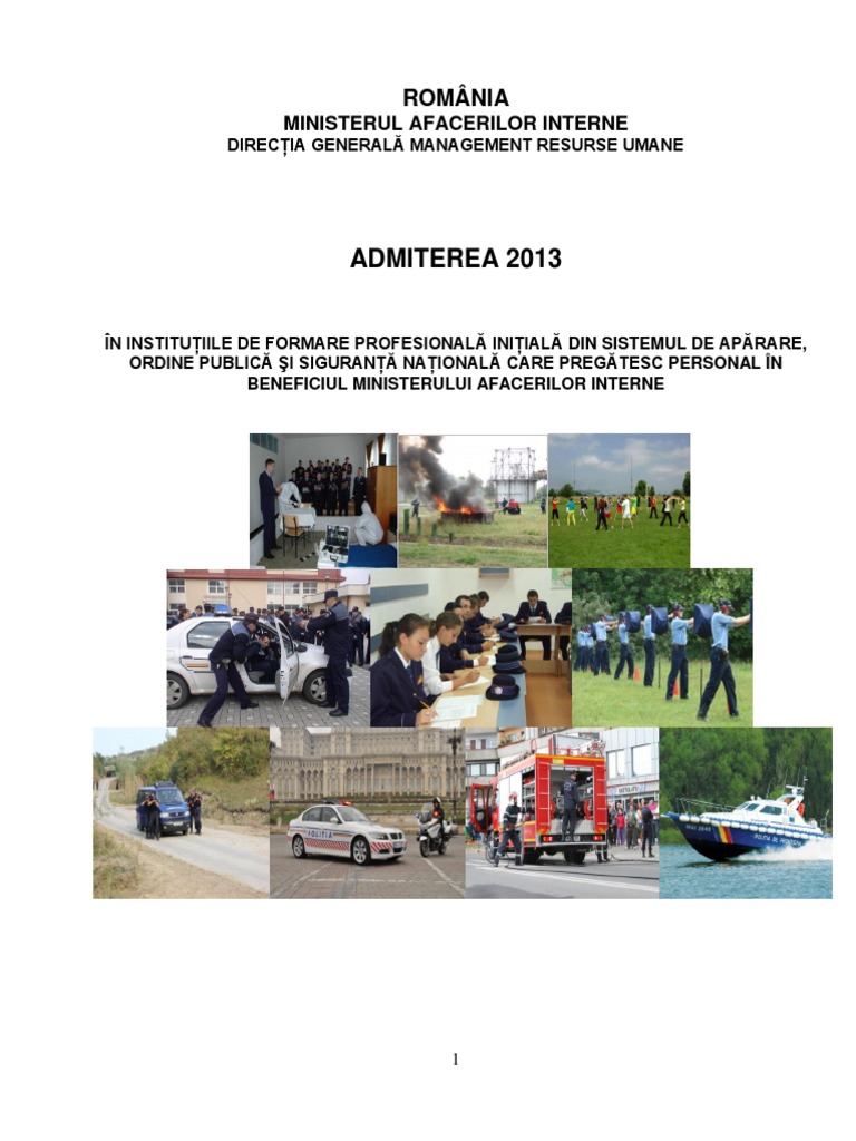 La probele eliminatorii - contravizita medical i verificarea aptitudinilor fizice a candidailor - nu se admit contestaii! 10. Probele de verificare a cunotinelor Probele de verificare a cunotinelor pentru admiterea la facultile Academiei de Poliie Alexandru Ioan Cuza se stabilesc n conformitate cu Regulamentul privind organizarea i desfurarea conc ursului de admitere la studii universitare de licen, n facultile Academiei de Poliie Alexandru Ioan Cuza, n anul 2013, i constau ntr -un test gril la urmtoarele discipline: a) istorie, limba romn, limba strin - englez/francez/german/rus/spaniol - pentru admiterea la Facultatea de Poliie; b) matematic i fizic - pentru admiterea la Facultatea de Pompieri; c) istorie - pentru admiterea la Facultatea de Arhivistic. Proba de verificare a cunotinelor pentru admiterea la colilor postliceale ale MAI se stabilete cu respectarea metodologiei de admitere i n conformitate cu dispoziiile de recrutare i selecie ale inspectorilor generali i const ntr-un test gril la disciplinele limba romn i limba englez sau francez, respectiv, n cazul colii de Subofieri de Pompieri i Protecie Civil Pavel Zgnescu Boldeti, matematic i fizic. Tematica i bibliografia pentru concursul de admitere se regsesc pe site-ul fiecrei instituii de nvmnt. 11. Etapele activitilor de recrutare i selecie pentru admiterea la Facultatea de Arhivistic Pentru admiterea la Facultatea de Arhivistic se parcurg urmtoarele etape: a) candidaii se adreseaz Serviciului Municipiului Bucureti al Arhivelor Naionale i/sau serviciilor judeene ale Arhivelor Naionale; b) efectueaz examinarea medical la una dintre policlinicile MAI din judeul de domicil iu; c) se nscriu, conform graficului/calendarului activitilor de admitere, la sediul Academiei de Poliie Alexandru Ioan Cuza, prezentnd dosarul de recrutare care conine documentele prevzute n Regulamentul privind organizarea i desfurarea concursului de admitere la studii universitare de licen, n facultile Academiei de Poliie Alexandru Ioan Cuza, n anul 2013; d) susin evaluarea medical i evaluarea psihologic dup nscrierea la sediul instituiei de nvmnt; e) susin proba de verificare a cunotinelor la istorie.