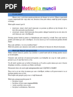 ntrebare 1. Sunt adesea nesigur pe abilitatea mea de a atinge obiectivele propuse. 2. Cnd lucrez pentru propriile obiective, depun efort maxim. 3. Obinuiesc s mi stabilesc obiective pentru a obine o viziune asupra vieii. 4. Gndesc pozitiv la stabilirea obiectivelor; m asigur c mi acoper nevoile la job i nu numai. 5. M recompensez (sau blamez) pentru a rmne concentrat. De exemplu, dac termin o sarcin la timp, mi iau o pauz de cafea. 6. Cred c voi avea [Link] muncesc din greu i mi folosesc abilitile 7. M ngrijoreaz termenele-limit, mi produc stres, anxietate. 8. Cnd apare un eveniment neateptat, am tendina de a lsa balt totul i a-mi stabili o nou int. 9. Cea mai mare satisfacie la finalizarea unei sarcini este sentimentul c mi-am fcut bine treaba. 10. Adesea fac minimum la job, doar ct s nu las loc efului sau colegilor la comentarii. 11. Tind s m ngrijorez cnd nu mi ating obiectivele i adesea m concentrez asupra motivelor pentru care aceasta se ntmpl. 12. mi conturez imaginea unui viitor plin de succese nainte de a-mi stabili un nou obiectiv.
