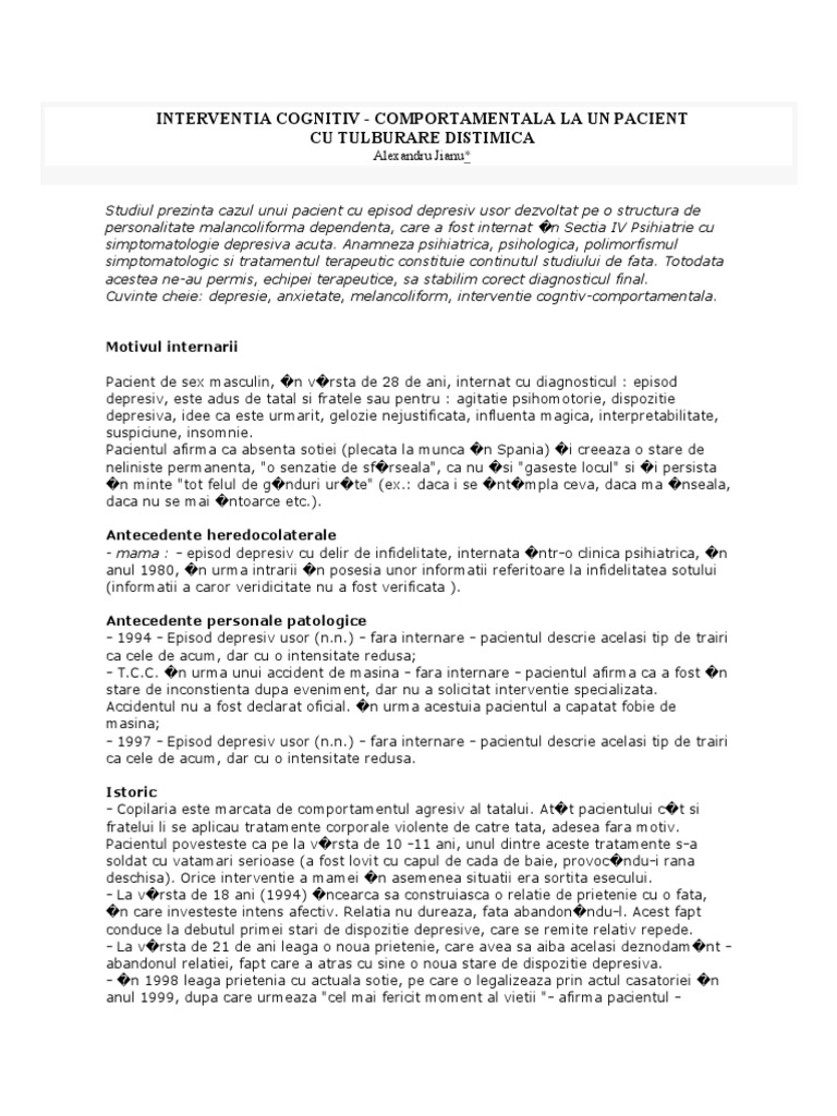 Cuvinte cheie depresie, an!ietate, melancoliform, interventie cogntiv-comportamentala.