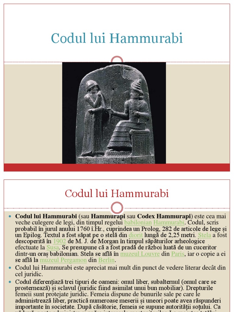 veche culegere de legi, din timpul regelui babilonian Hammurabi. Codul, scris