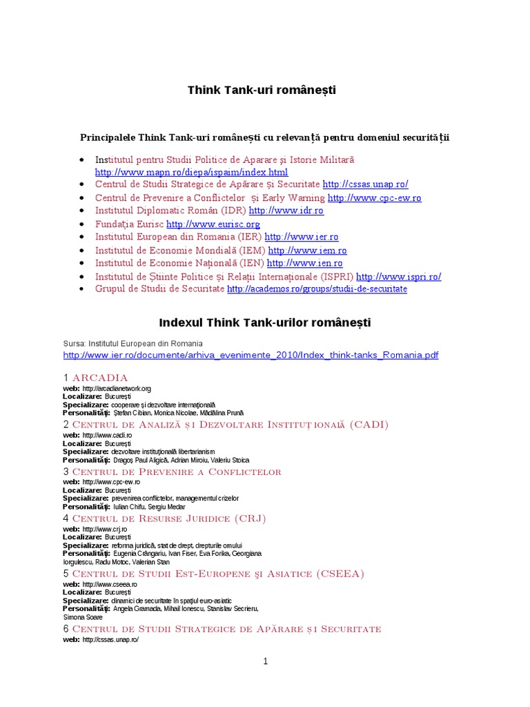 Principalele Think Tank-uri romne ti cu relevan pentru domeniul securit ii