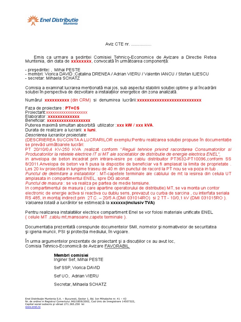 Emis ca urmare a edinei Comisiei Tehnico-Economice de Avizare a Directie Retea