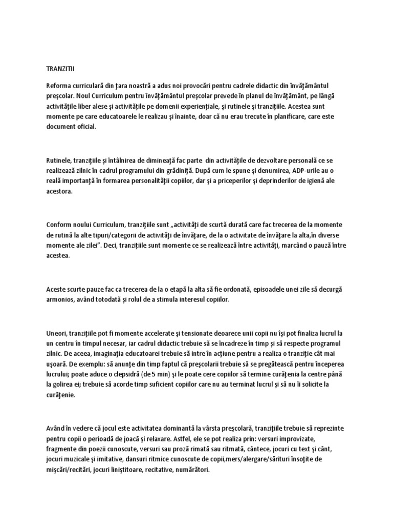 Conform noului Curriculum, tranziiile sunt activiti de scurt durat care fac trecerea de la momente