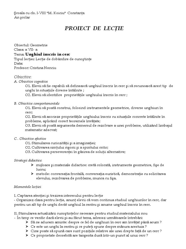 O1. Elevii s fie capabili s defineasc unghiul nscris n cerc i s recunoasc acest tip de