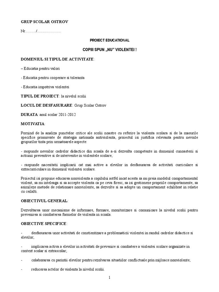 Proiectul isi propune educarea nonviolenta a copilului astel incat acesta sa nu preia modelul comportamental