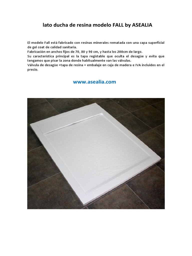 El modelo Fall está fabricado con resinas minerales rematada con una capa superficial de gel coat de calidad sanitaria. Fabricación en anchos fijos de 70, 80 y 90 cm, y hasta los 200cm de largo. Su característica principal es la tapa registable que oculta el desagüe y evita que tengamos que pisar la zona donde habitualmente van las válvulas. Válvula de desagüe +tapa de resina + embalaje en caja de madera e IVA incluidos en el precio.