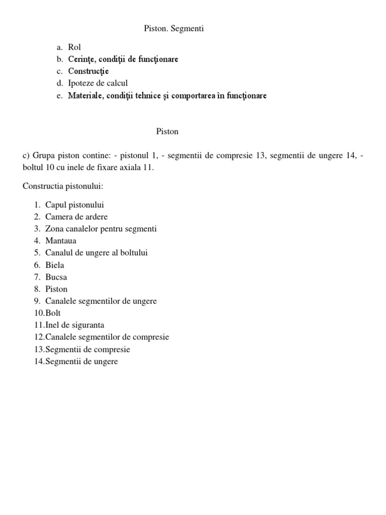 c) Grupa piston contine: - pistonul 1, - segmentii de compresie 13, segmentii de ungere 14, boltul 10 cu inele de fixare axiala 11.