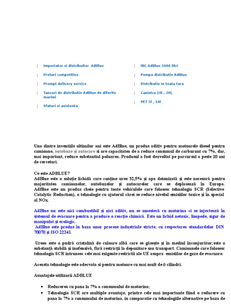 AdBlue este o soluie lichid care conine uree 32,5% i apa deionizat i este necesar pentru